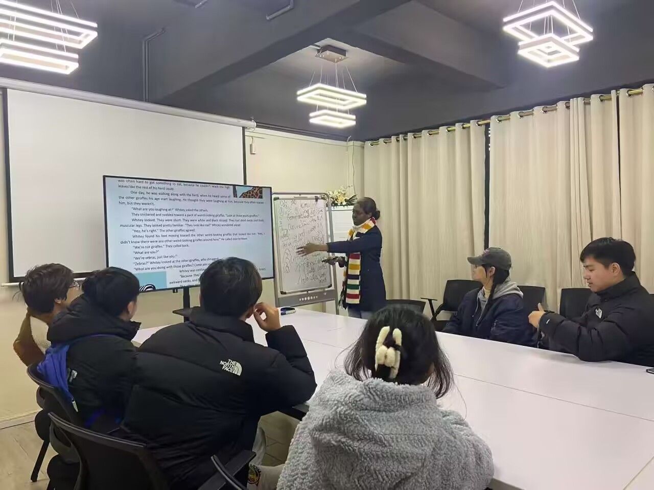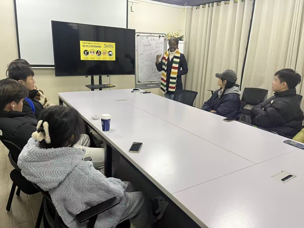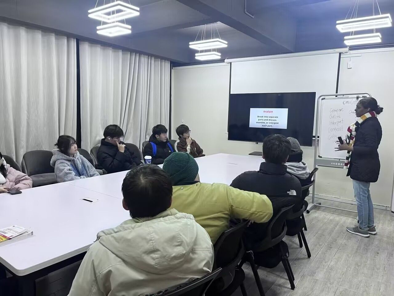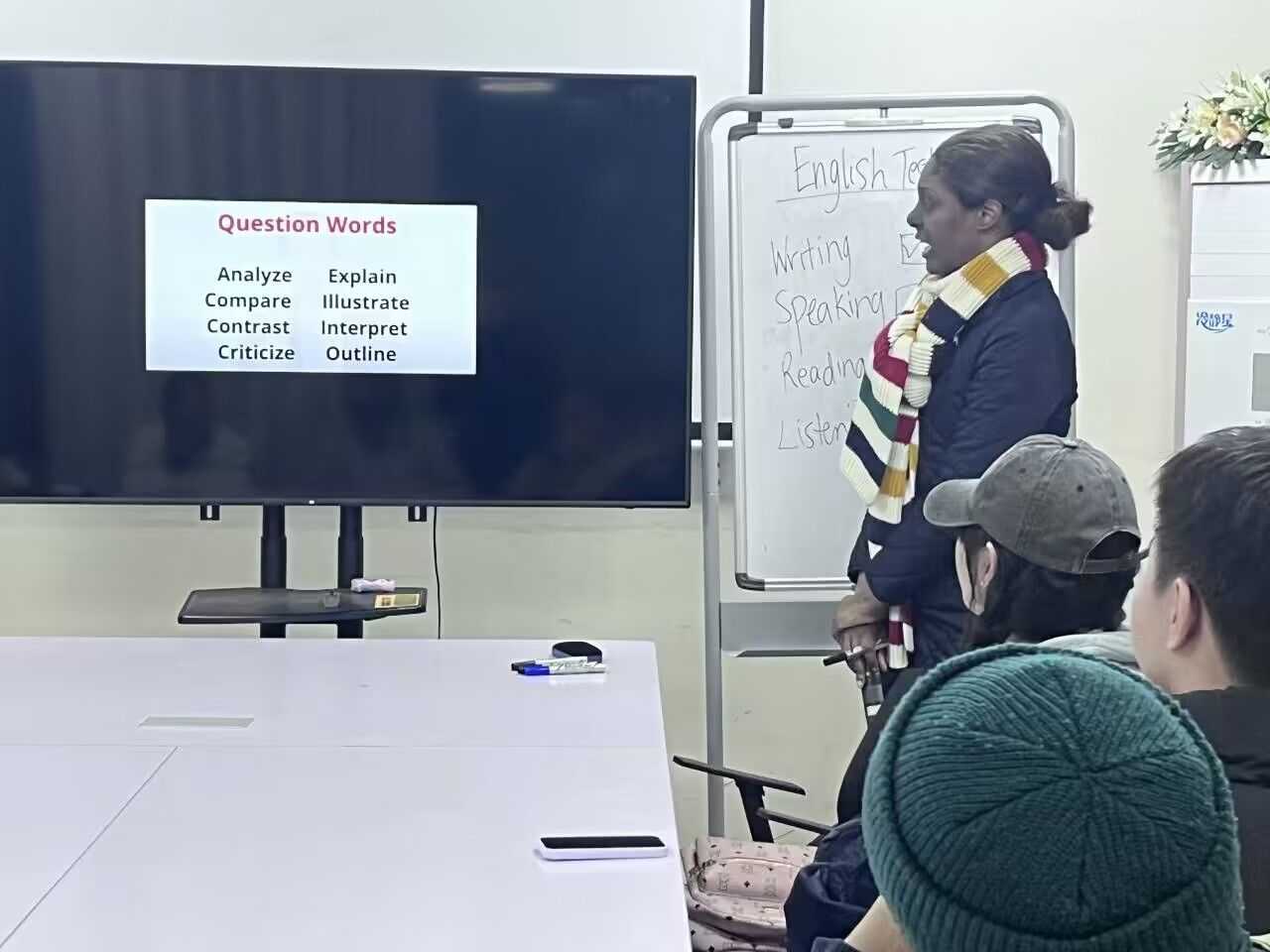 活动伊始,外教Kris深入浅出地分析了四六级阅读、写作、翻译以及四六级听力和雅思听力的备考要点,为同学们指明了备考方向。她提到,听力部分需要同学们提前熟悉题型,提高听力速度,并在平时的训练中多做笔记。阅读部分则要求同学们掌握不同题型的答题方法,增加阅读量,积累词汇量,并注意段落结构。