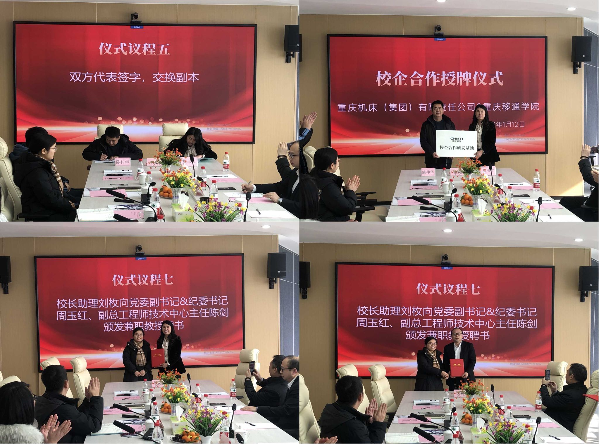 仪式最后一项议程,陈仲华校长与周玉红书记共同签订了校企合作战略协议,并为“重庆机床(集团)有限责任公司校企合作研发基地”和“重庆移通学院校外实习基地”授牌。由校长助理刘枚为周玉红书记和陈剑主任颁发外聘教授聘书。