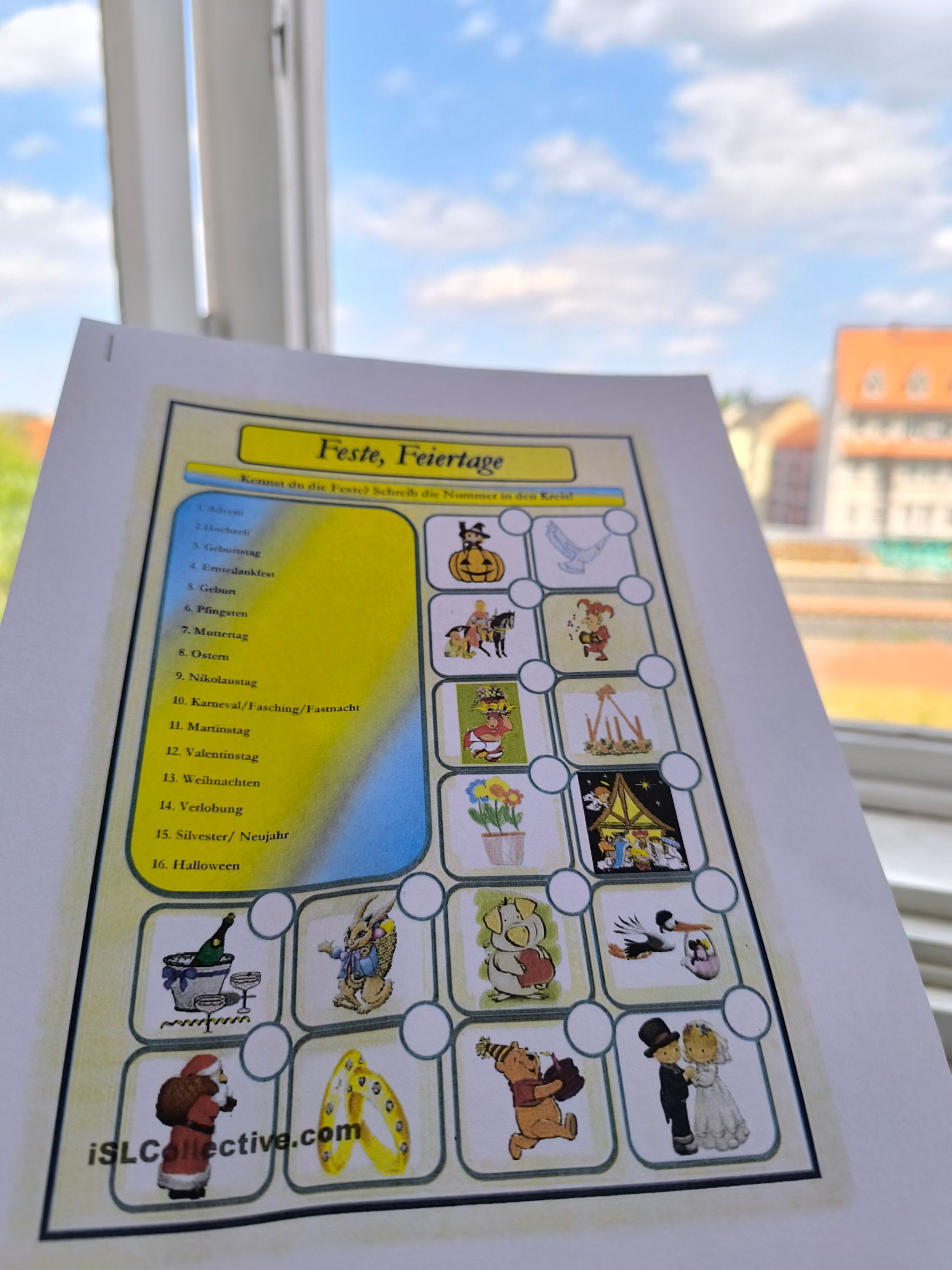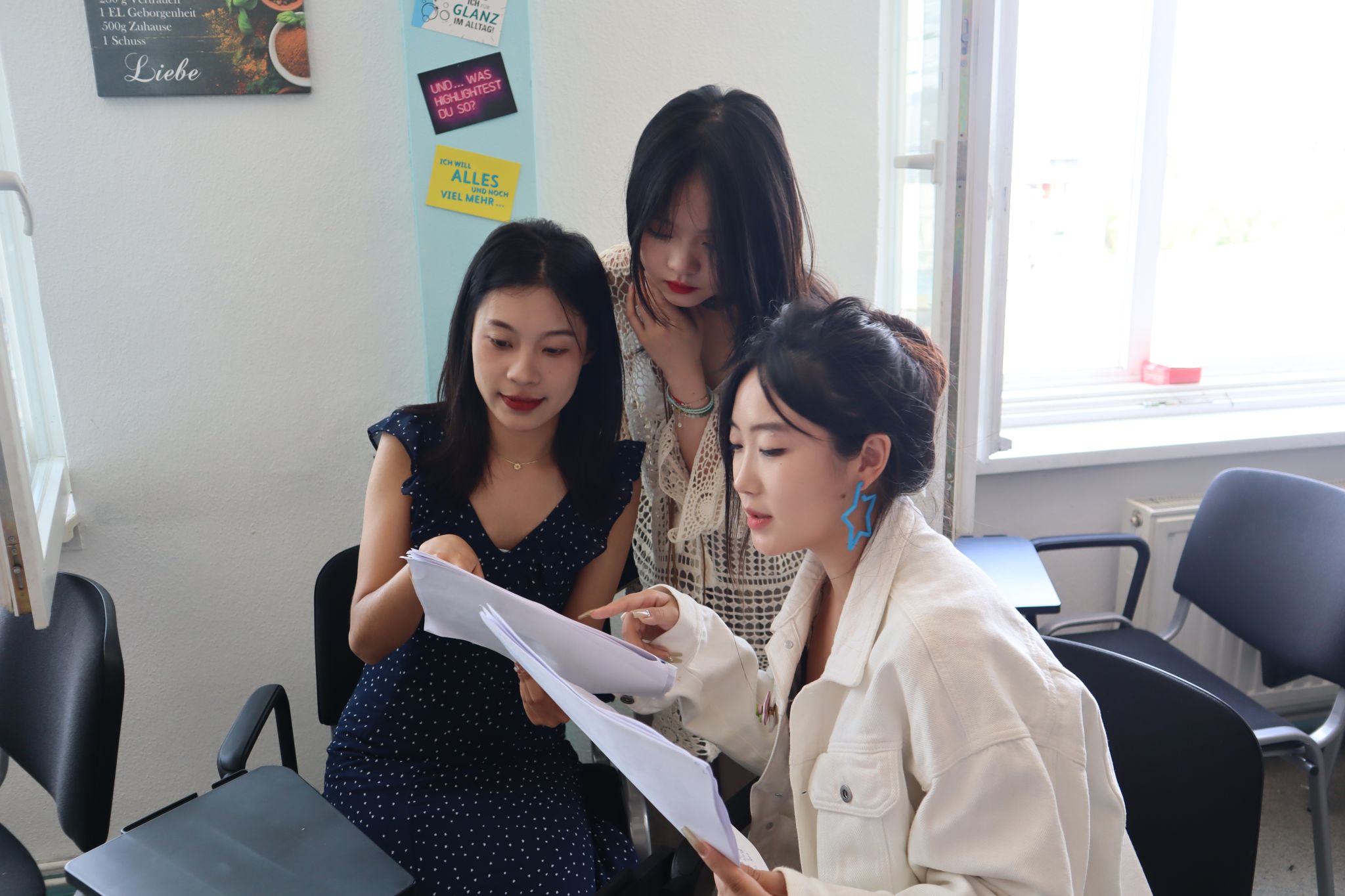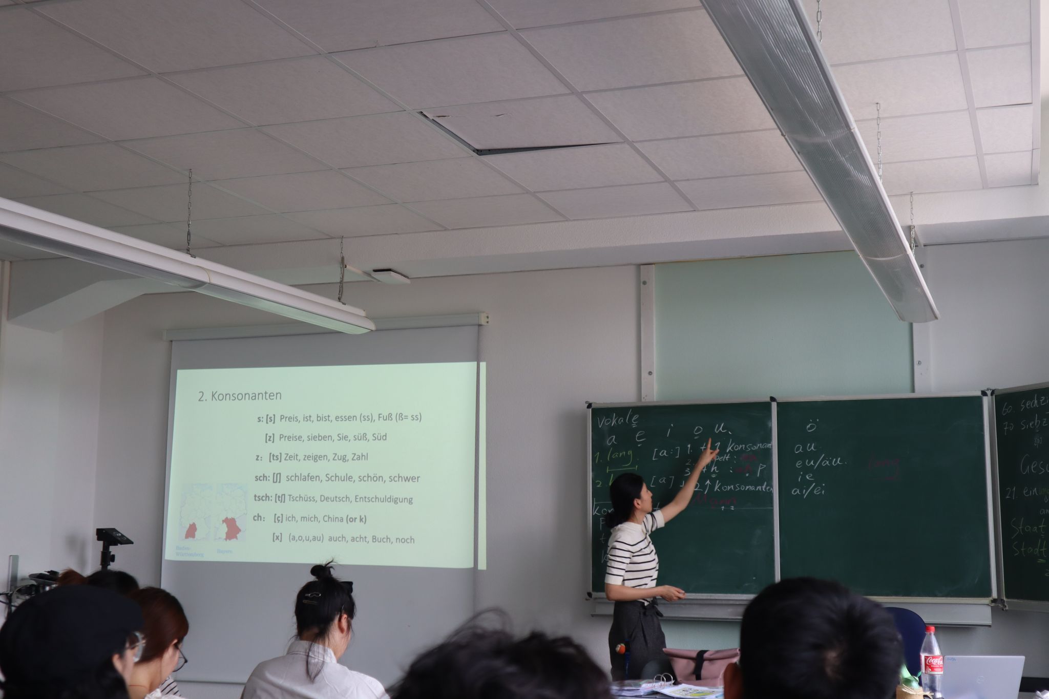 “我学会了”、“同学,非常棒!”“有趣!”,德语老师生动的讲解让德语不再是冰冷的文字,而是德国历史文化变迁的活相标,不同的方言不同的表达都集中体现了环境对文化的影响,从1到100的德语数字,每一个都像是天文数字一般给我们的课堂增加了些许乐趣,拼凑的炸弹游戏让德文数字在纸张上到处乱跑,带着映照在书上的笑脸也变成了哭脸,随时变化的语音读法,让大家“愁眉苦脸”。