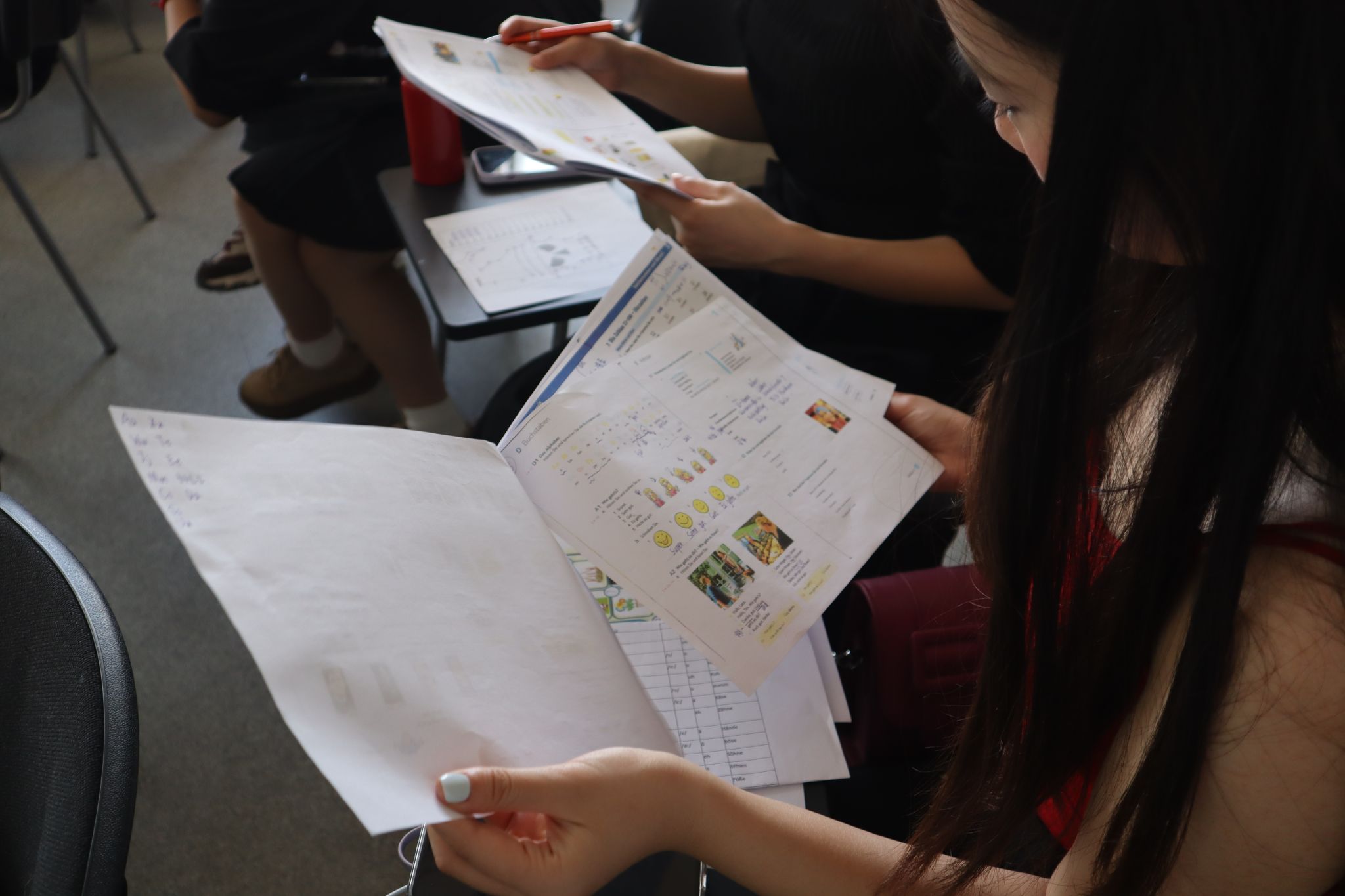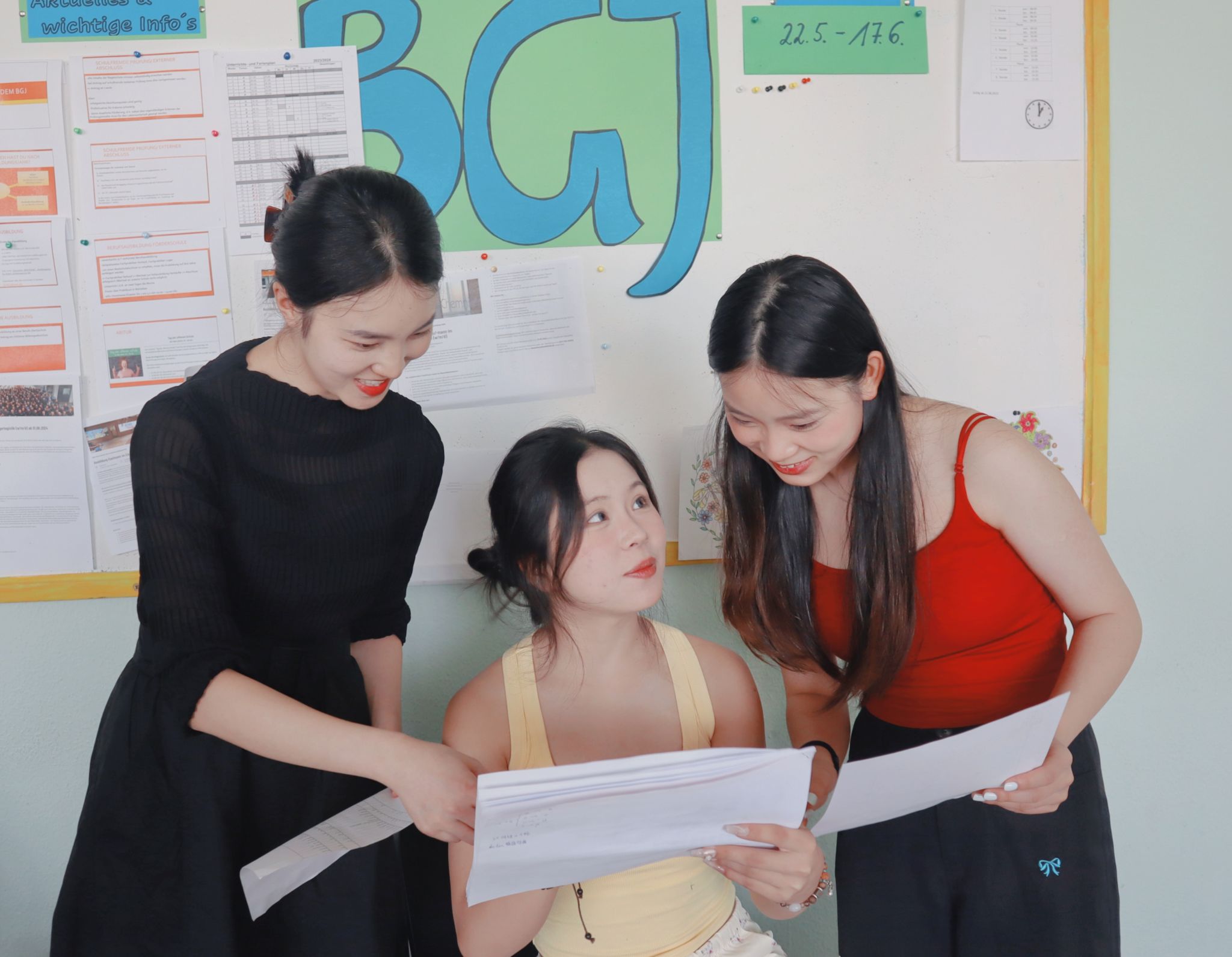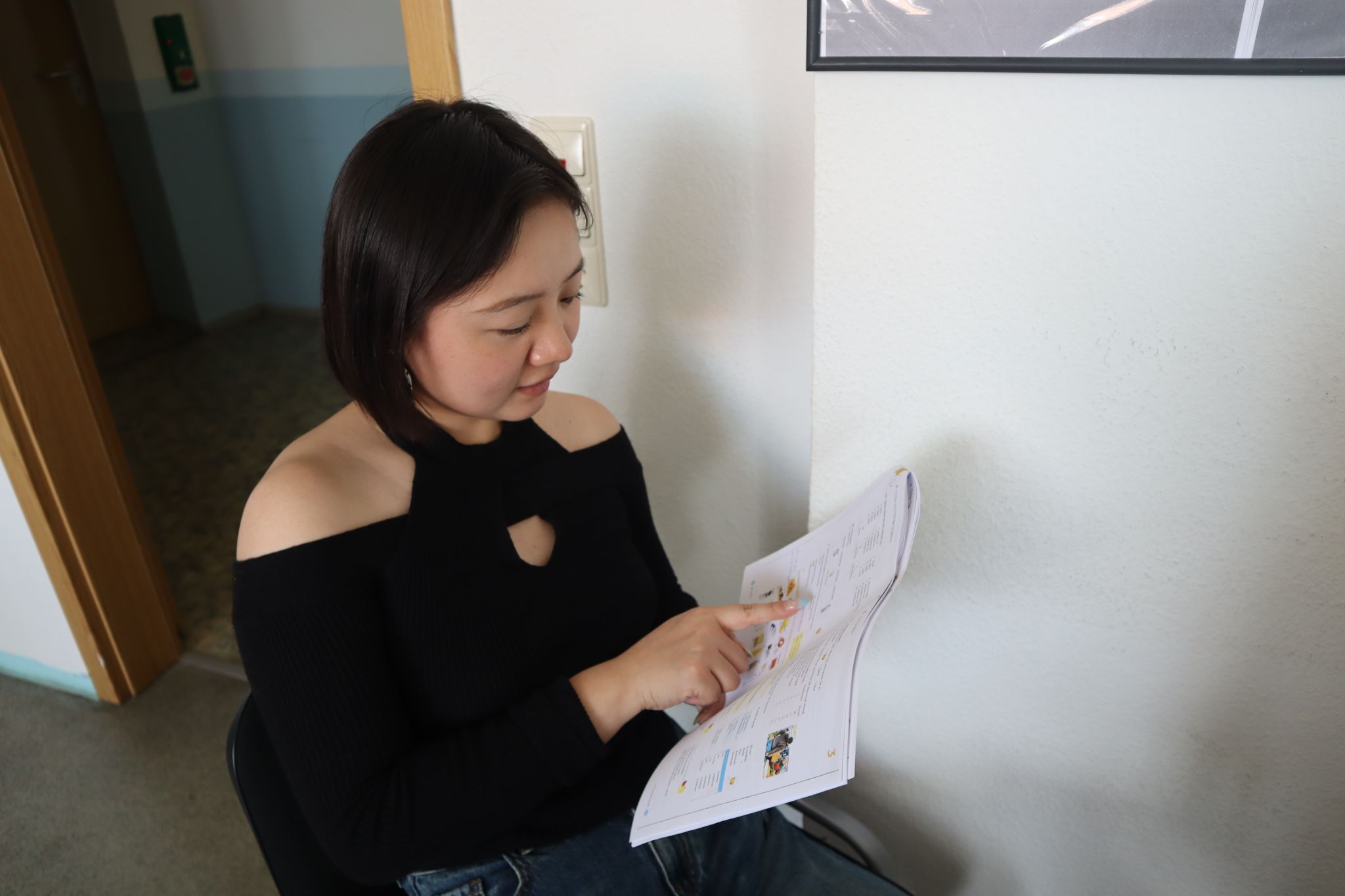 “我学会了”、“同学,非常棒!”“有趣!”,德语老师生动的讲解让德语不再是冰冷的文字,而是德国历史文化变迁的活相标,不同的方言不同的表达都集中体现了环境对文化的影响,从1到100的德语数字,每一个都像是天文数字一般给我们的课堂增加了些许乐趣,拼凑的炸弹游戏让德文数字在纸张上到处乱跑,带着映照在书上的笑脸也变成了哭脸,随时变化的语音读法,让大家“愁眉苦脸”。
