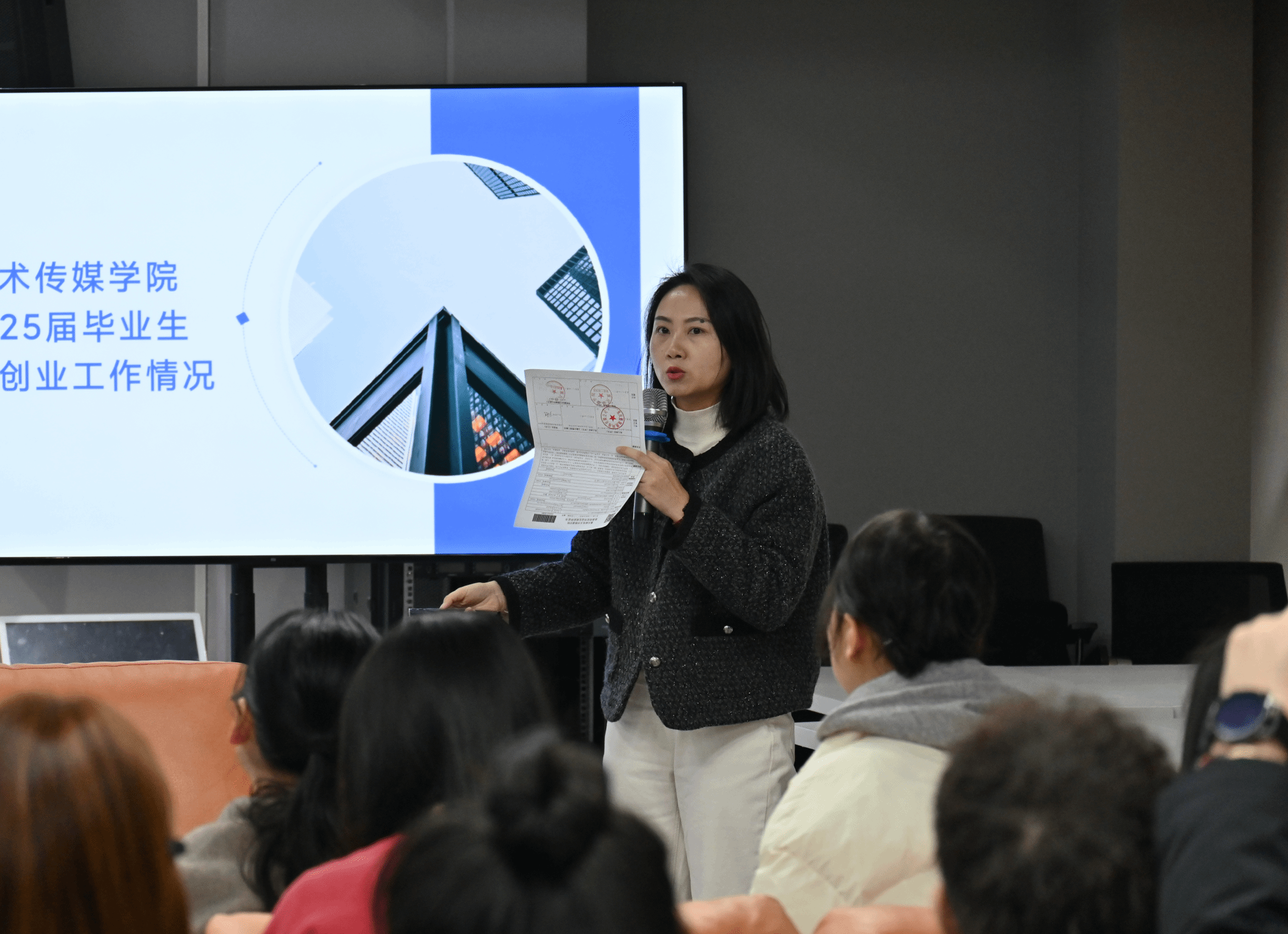 随后,郭菲副院长就2025届毕业生的就业创业工作情况进行了全面而细致地介绍。她强调,学院始终将学生的就业创业工作置于极其重要的位置,致力于构建一个全方位、多层次的就业创业服务体系。郭菲副院长鼓励教师们成为学生的良师益友,不仅在学业上给予指导,更要在职业规划、求职技巧、心理调适等方面提供必要的帮助和支持,为毕业生的顺利毕业和就业提供坚实的保障。与此同时,为进一步响应教育部“访企拓岗促就业”专项行动要求,学院将定期组织专项考察团队走访调研相关企业,通过实地考察、座谈交流等形式,深入了解企业需求,探索校企合作新模式,积极拓宽毕业生就业渠道,为毕业生提供更多元、更高质量的就业岗位选择。她指出,全体教师要利用自身的专业优势与行业经验,为学院的就业工作添砖加瓦,共同推动形成学院、企业、学生三方共赢的良好局面,为实现毕业生高质量就业贡献力量。