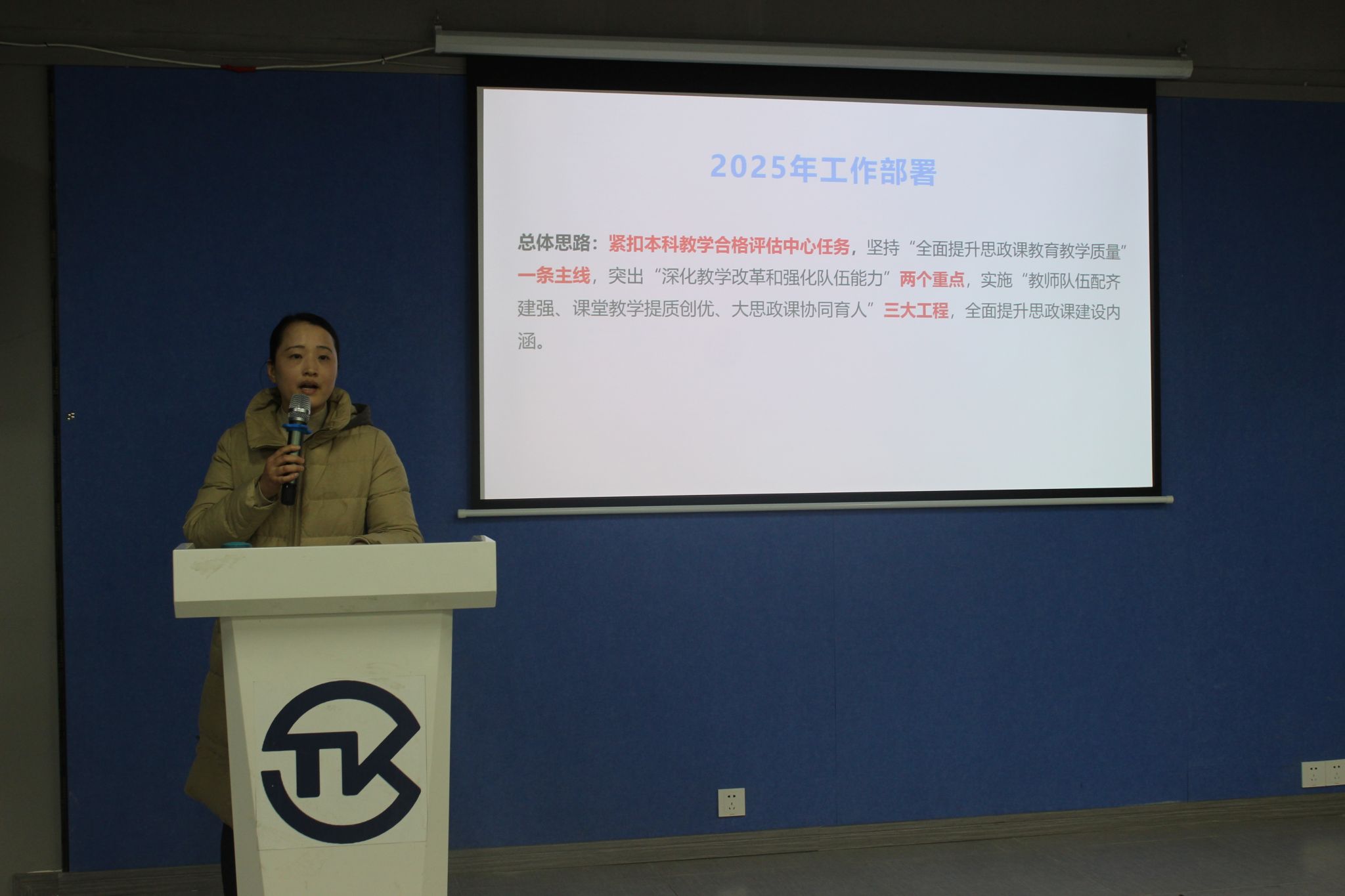 接着,邓院长对学院2025年工作进行了部署,她强调,2025年是学校备战本科教学合格评估攻坚之年,学院将紧扣学校本科教学合格评估中心任务,坚持“全面提升思政课教育教学质量”一条主线,突出“深化教学改革和强化队伍能力”两个重点,实施“教师队伍配齐建强、课堂教学提质创优、大思政课协同育人”三大工程,全面提升思政课教育教学质量。在新的一年,她希望全体教师以党的二十届三中全会精神和习近平新时代中国特色社会主义思想为指引,遵循创新、高效、协作驱动的工作思路,以更饱满的热情、更坚定的信念和更扎实的工作,推动马克思主义学院建设迈上新台阶。