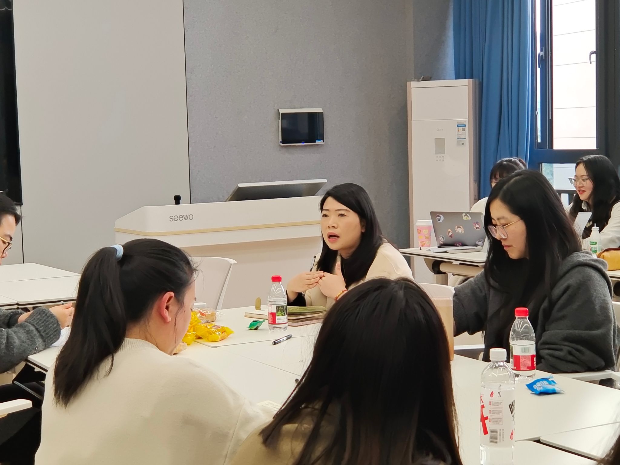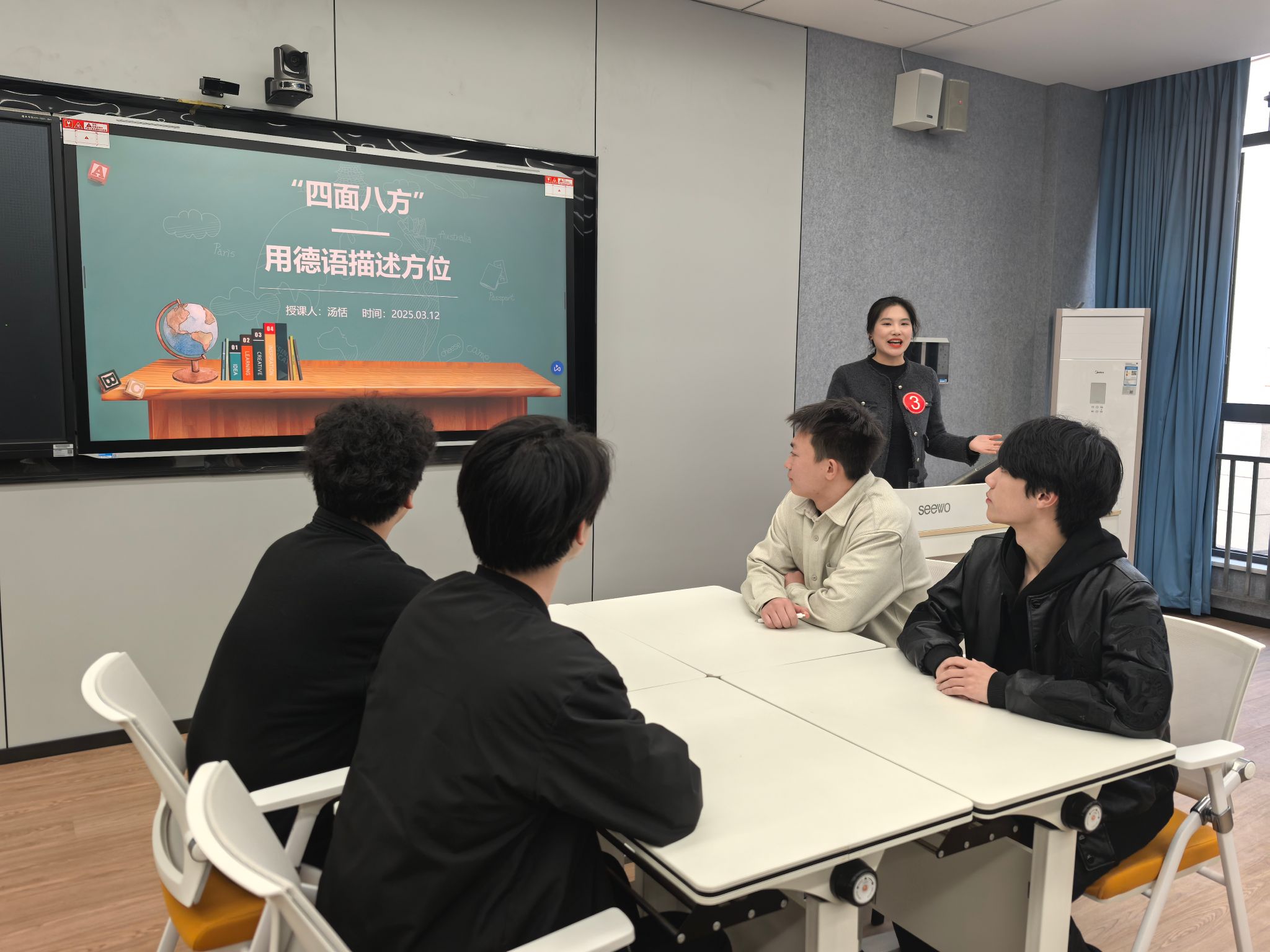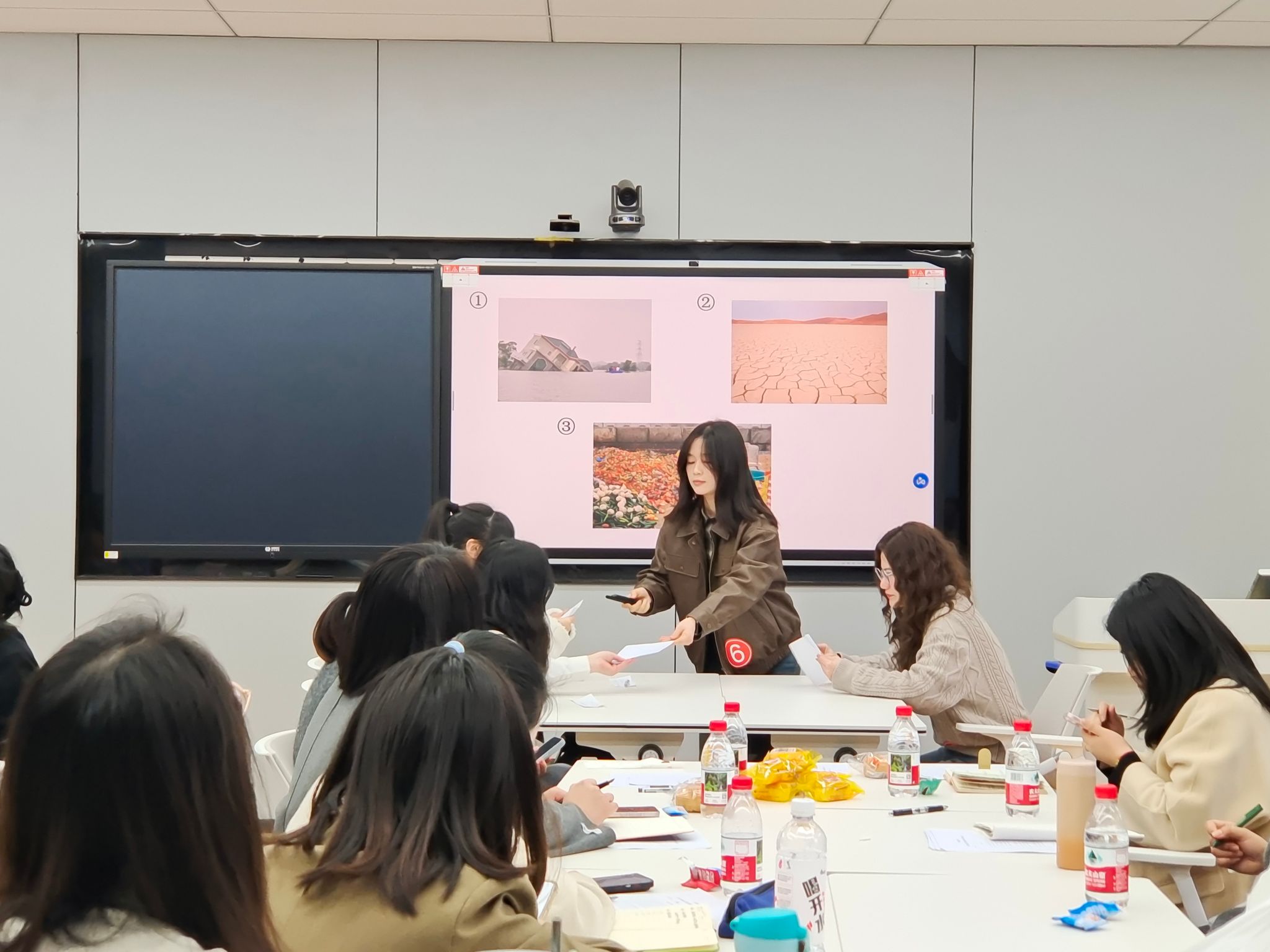 5号裴艺遥老师以多种教学理论为基础,使用VR模拟,加强学生对雅思听力地图题的辨析,提高学生的空间认知。6号计媛老师结合多种教学方法,讲授针对man的人称变位和情态动词können的用法,并且提供日常生活中应对环境问题的措施,增强学生保护环境的意识。