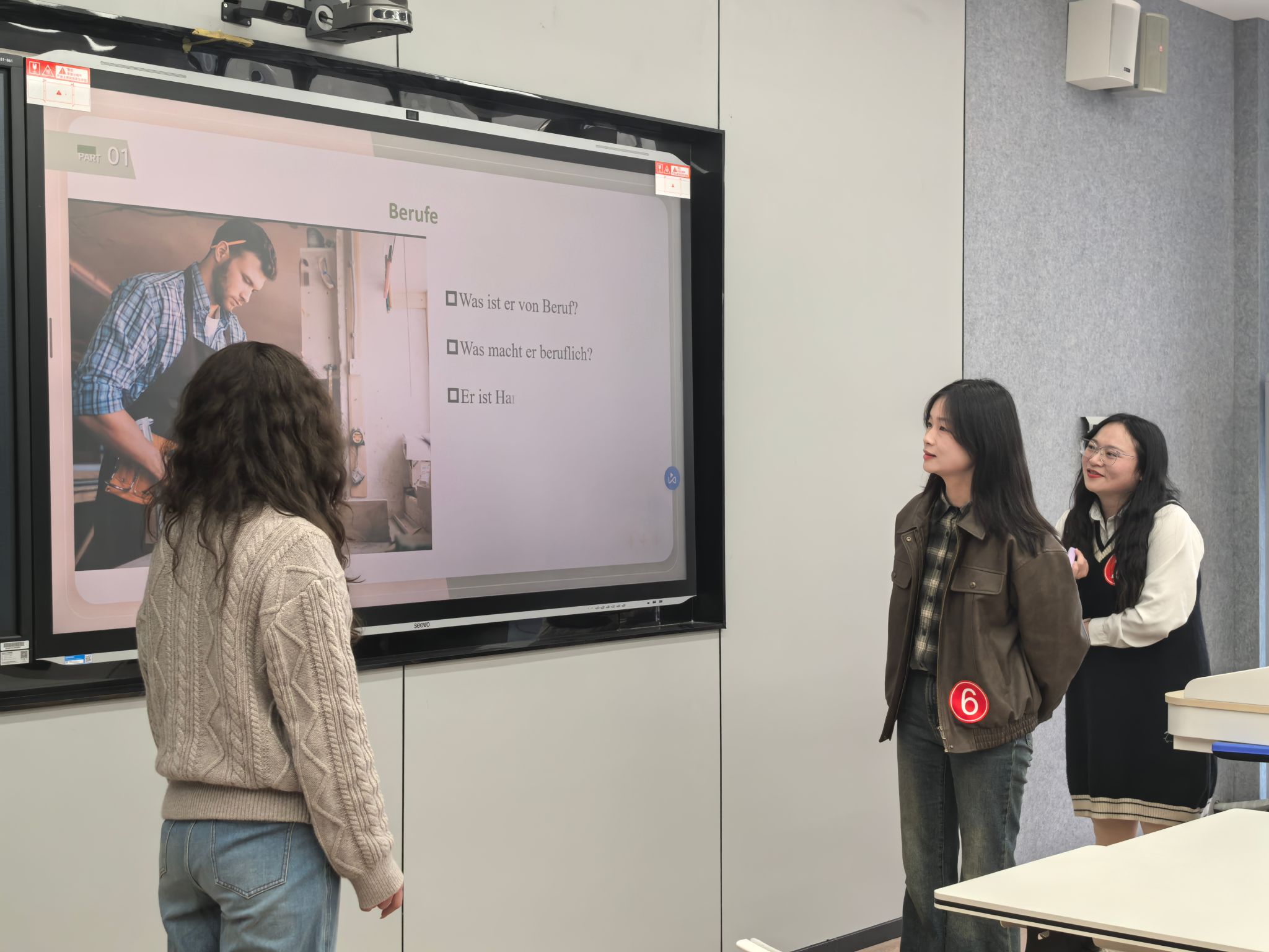竞赛现场,各位参赛教师纷纷使出浑身解数,展现了扎实的教学功底和独特的教学风采。1号谢丹妮老师将德语语法知识巧妙融入实际语境,结合游戏强调户外活动和健康生活方式的重要性。2号杨云秋老师则通过讲授德语阴性和阳性职业、问答职业信息的句型等,启发学生职业无需用性别设限。