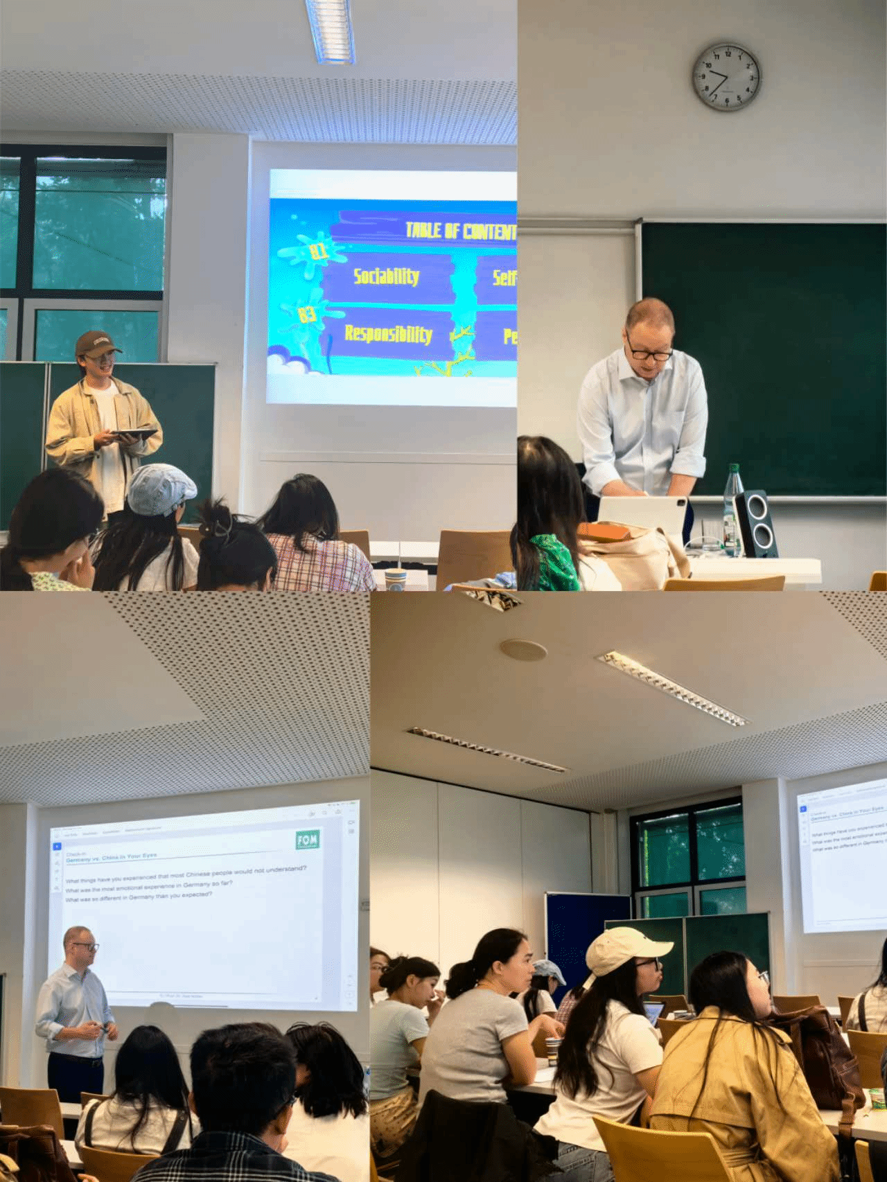 在德国夏令营期间,师生体验到多样化的课程与丰富多彩的拓展活动,包括充满乐趣的德语小课堂,跨文化交流研讨会,演讲技能培训以及领导力培训课程,通过实践与理论相结合的教学方式,提升了师生在多元文化中的交流沟通能力。此外,还穿插了各类体育活动、艺术活动及团建活动等。这一系列精心设计的活动,不仅丰富了师生的体验,也让德国友人深切感受到了中国大学生阳光自信、多才多艺的风采。