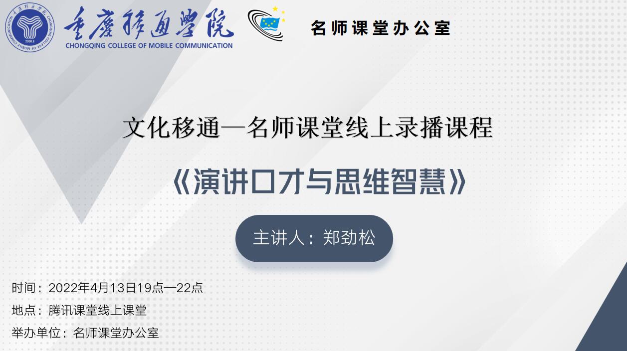 4月13日晚7点,“名师课堂线上录播课程”播放了西南大学党委宣传部副部长郑劲松老师的《演讲口才与思维智慧》讲座,让同学们能够深入的了解建立多样的思维方式对演讲效果的表现有多么重要。人类思维是“世界上最美丽的花朵”,而过硬的演讲才能背后是其灵活丰富的思维智慧做为支撑,因此一场精彩的演讲往往以思维敏捷发达为前提,只有这样,才能称得上是一位雄辩的演说家。