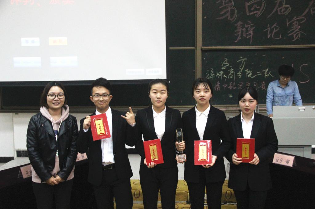 (演讲与辩论协会指导老师与冠军队伍合影留念)