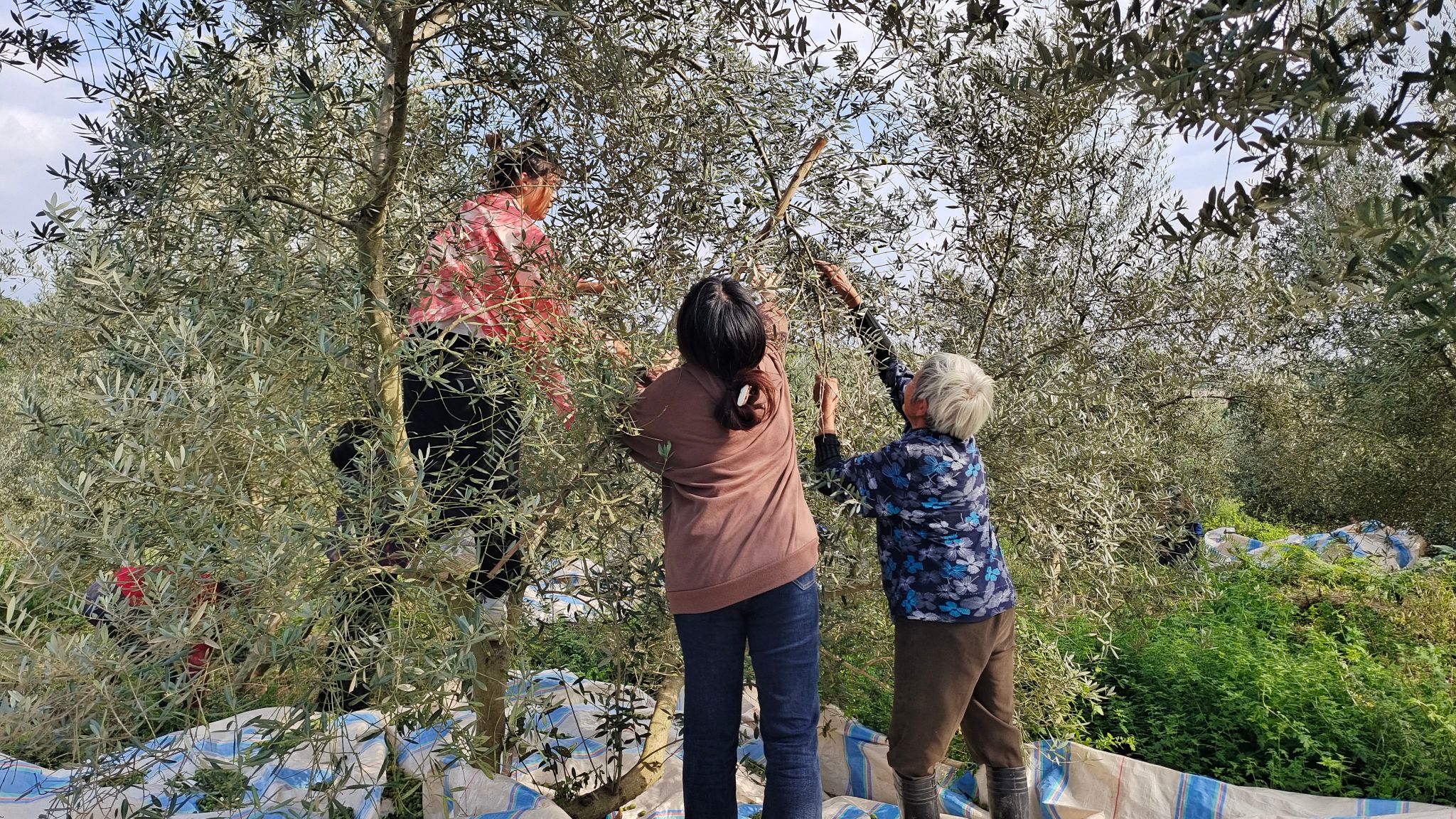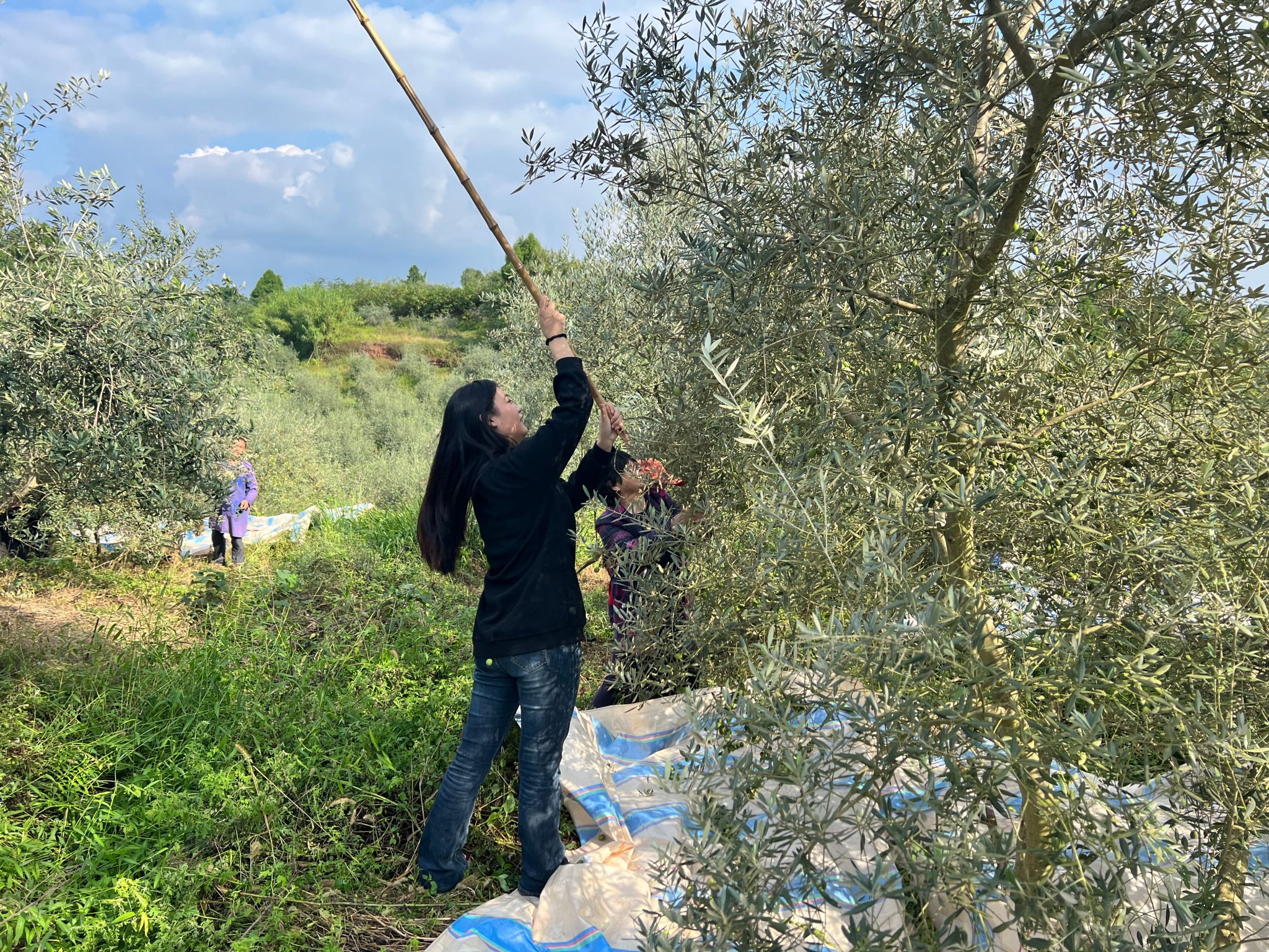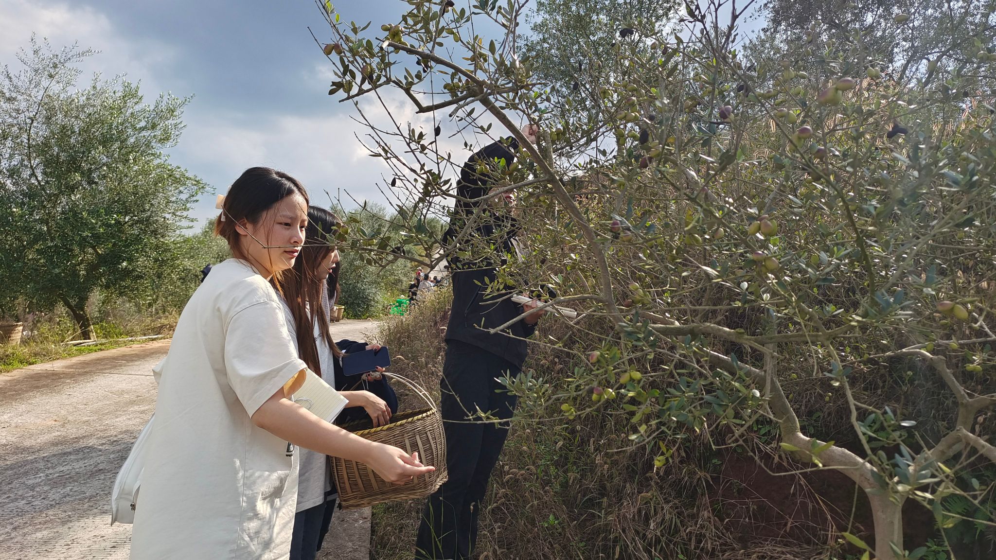 随后,大家来到了渝江源公司的油橄榄示范基地参观。曾经这里还是一片荒山,如今是一望无际的3万亩油橄榄树。“绿水青山就是金山银山”,这句话是江源橄榄种植基地最显目的标语,也是公司对环境保护的态度。10月的油橄榄正是丰收的季节,油橄榄挂满了树枝,油橄榄林间有工人正在进行采摘。同学们主动帮忙采摘,沉浸式体验油橄榄丰收的喜悦。在与采摘的工人交流时得知,为了保证橄榄油的品质,油橄榄林的杂草拒绝使用除草剂,全部由工人用镰刀割草。