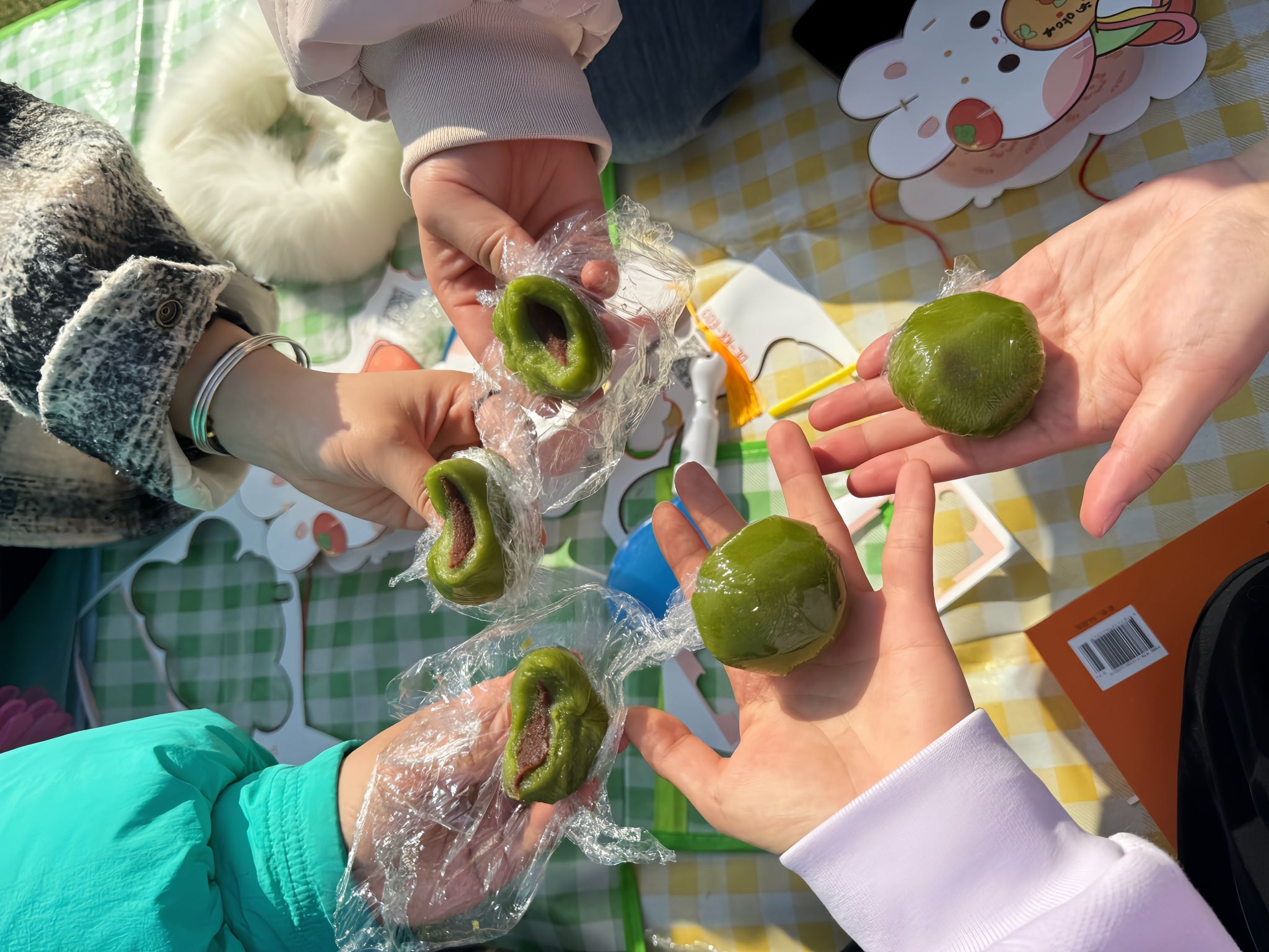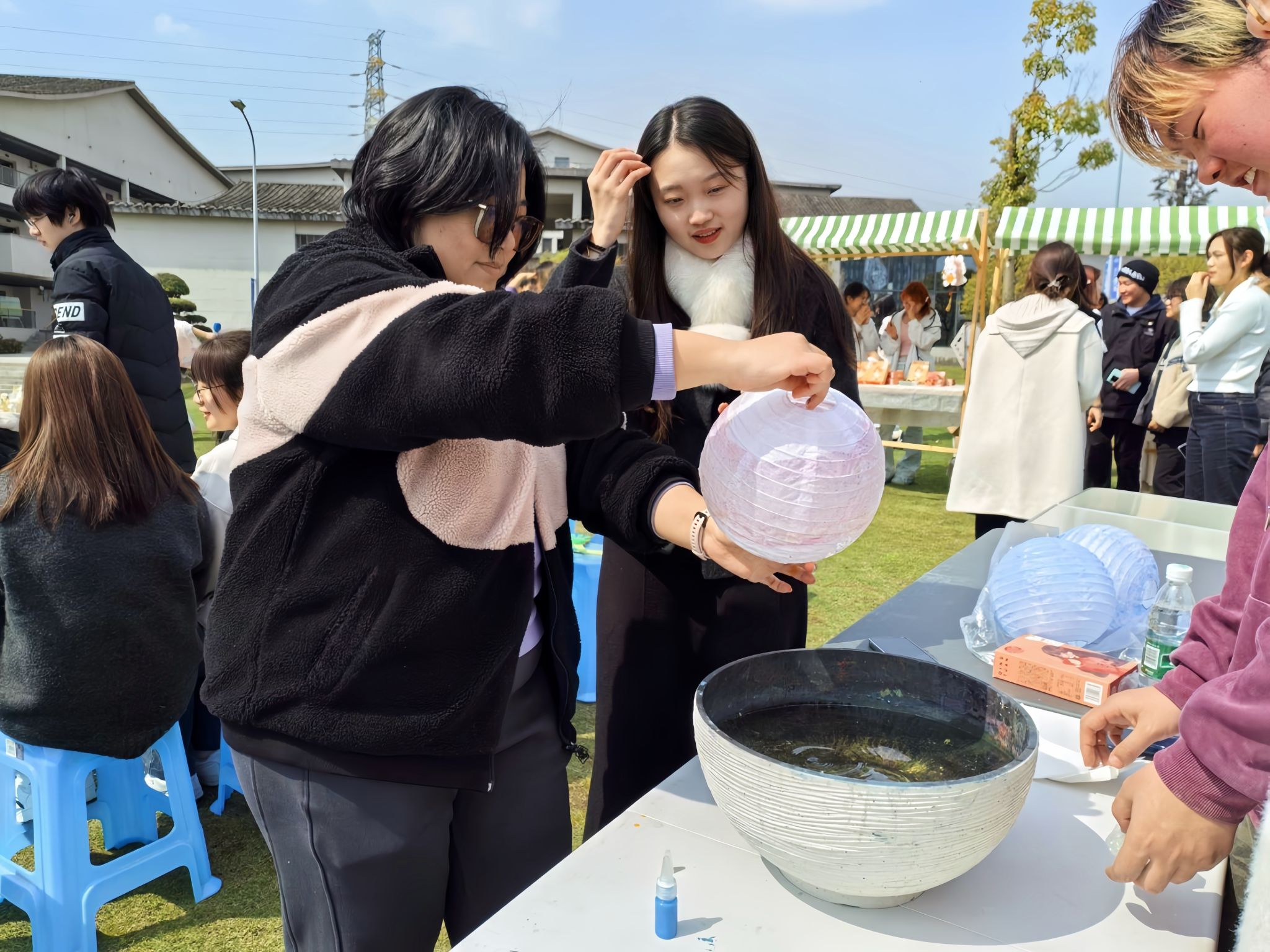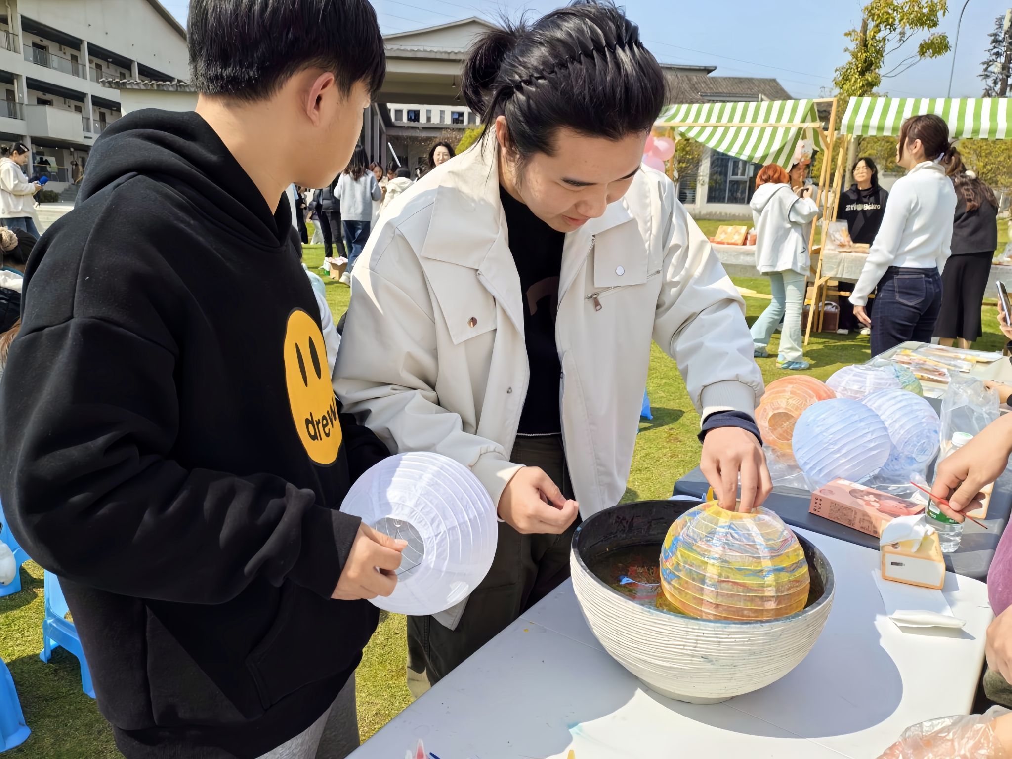 漂漆灯笼制作也另有一番巧思。同学们将竹篾棉纸糊成的灯笼浸入染缸,漂漆晕染出绚丽色彩。参与者在完成灯笼制作后还可以领取传统美食青团一份,同学们相互协作,创意碰撞,共同探索中国文化,体验中华美食。