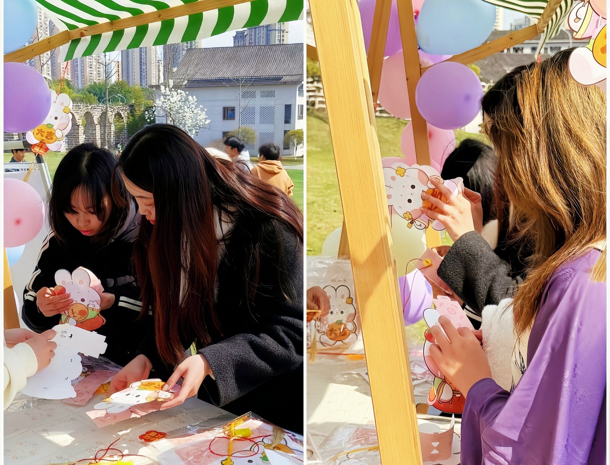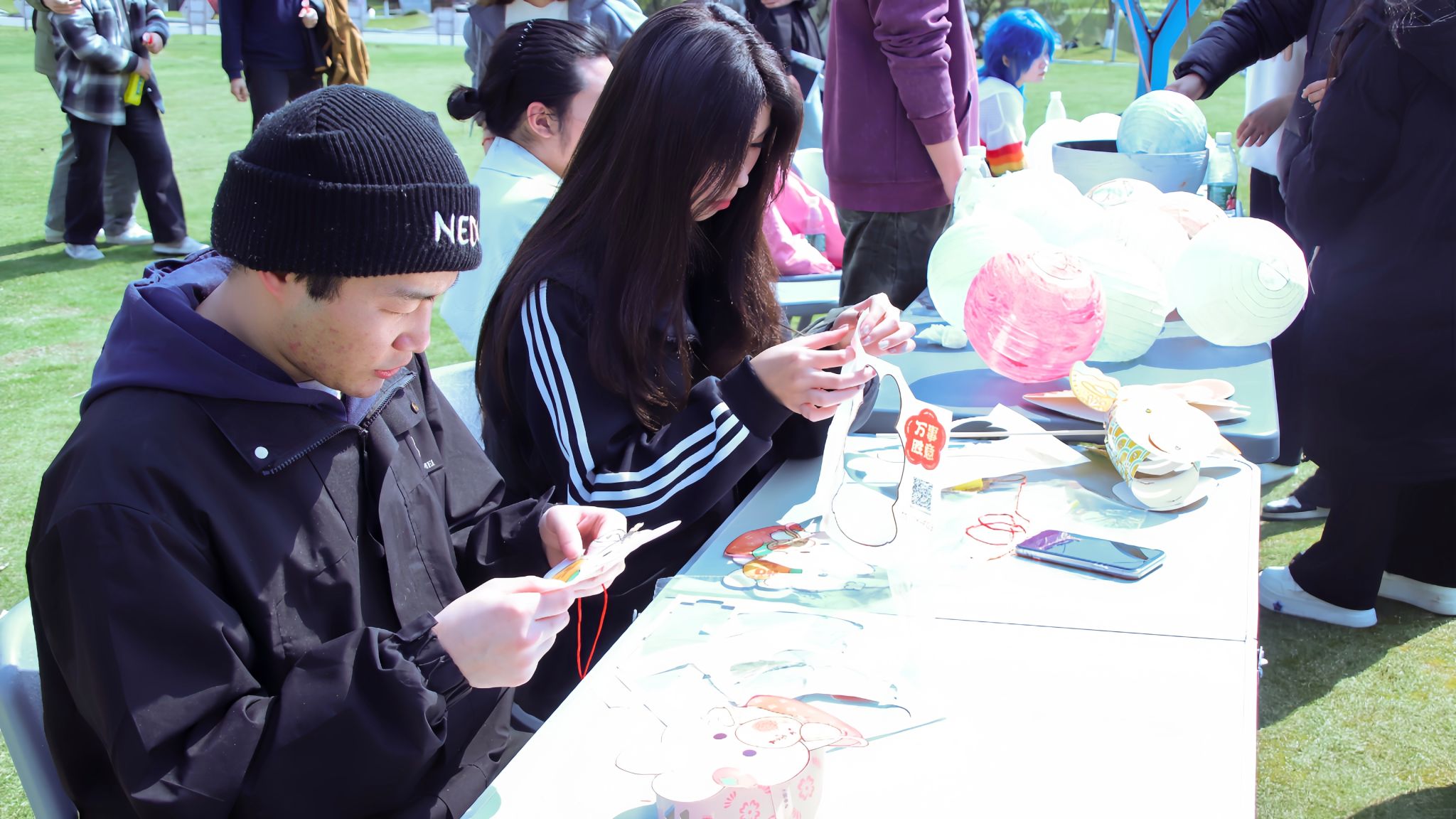 千盏灯笼点亮校园,每一盏都是匠心与创意的结晶。活动现场也特别准备了彩色卡纸、竹条等多样材料,吸引同学们在享受音乐的同时体验传统手工艺-灯笼制作。萌兔灯笼在大家巧手下诞生,现场节日氛围浓厚。