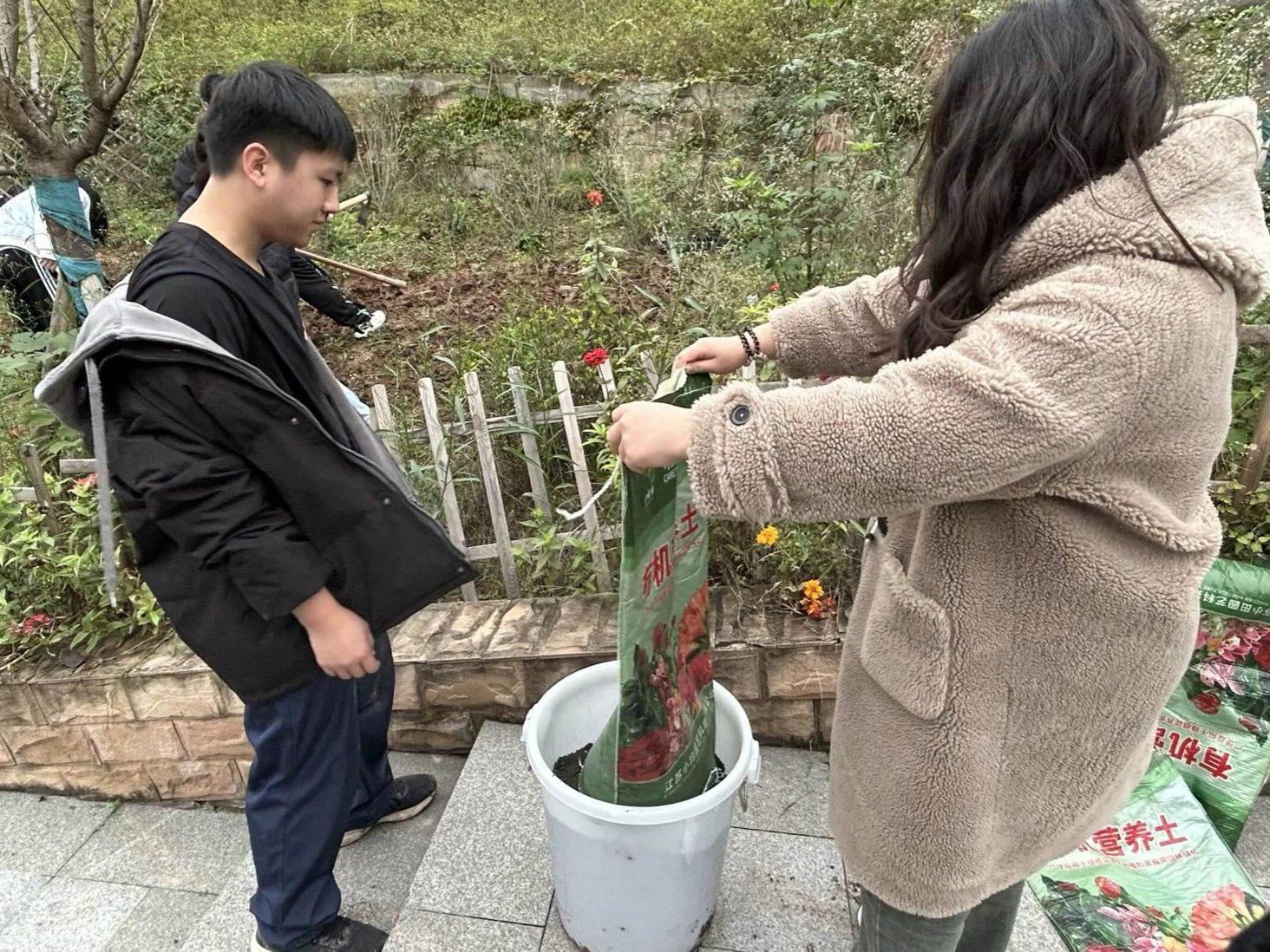 活动现场,同学们手持农具,个个干劲十足。翻地的同学弯下腰,用力挥动着锄头,将坚硬的土地一点点翻松,拌土的同学则格外细心,他们蹲在土堆旁,神情专注而认真。用铲子轻轻地将肥料铲起,均匀地撒在土壤上,然后再用工具反复搅拌。确保为植物提供最适宜,最肥沃的生长环境。