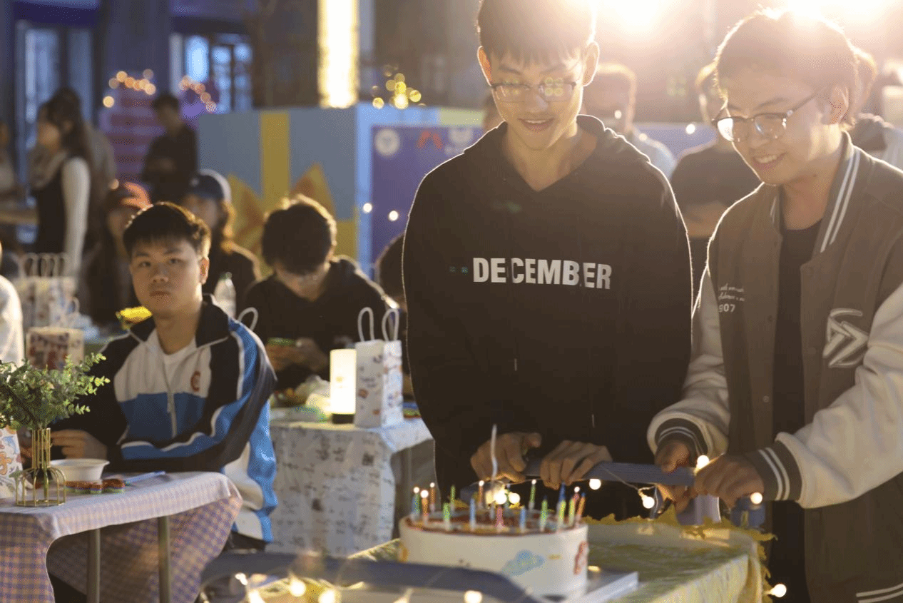 看着从第1次生日会到第20次生日会的回顾视频,感受着此刻亲朋好友送来的祝福,听着生日快乐歌,大家一同上台共同许下心愿,蜡烛点燃和熄灭的瞬间,一声“生日快乐”传递出最朴素的祝福。今天不仅是各位寿星的生日,亦是陪伴我们走过三载的綦河书院的生日,綦河书院自2021年10月24日以一场师生集体生日会的方式正式投入使用,今天刚好迈过三个年头,现场同学们也在此刻一同向綦河书院送上了最诚挚的祝福。这一刻不仅是对生日的庆祝,更是对未来美好生活的期许。