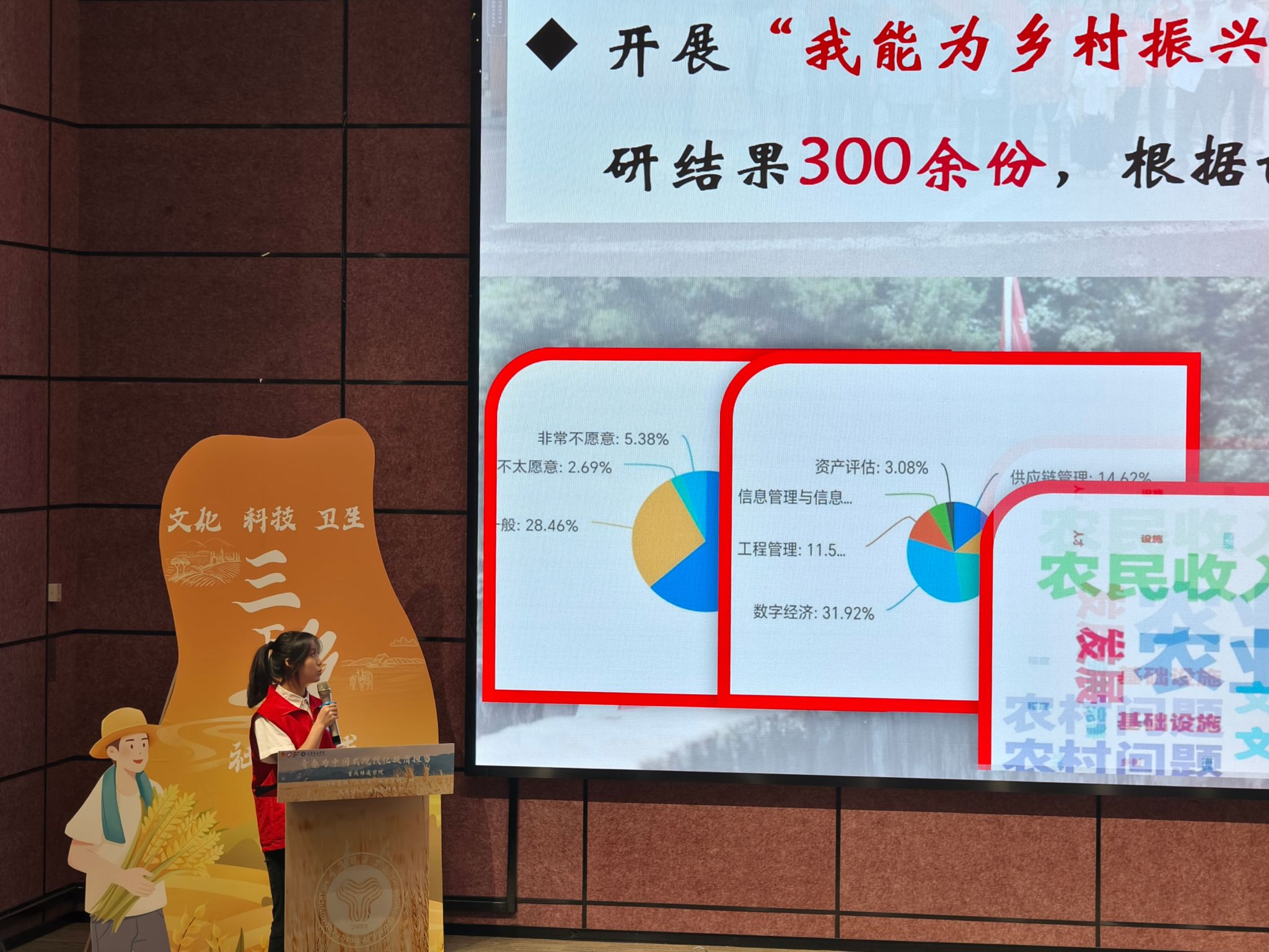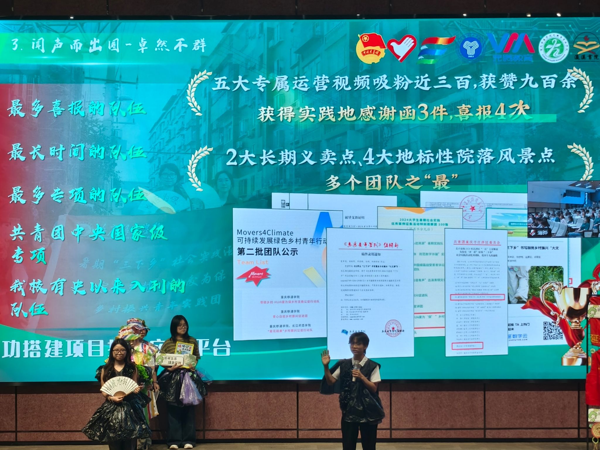 “零碳乡村·HUA废为保”乡村振兴促进团成员们详细阐述他们的实践经历。他们深入乡村,与村民面对面交流,了解乡村的实际情况和村民的需求。在答辩现场,他们通过数据展示、案例分析和现场模拟等多种形式,生动展示了他们的项目进展和取得的成效,展现出乡村振兴的蓬勃活力和无限可能。