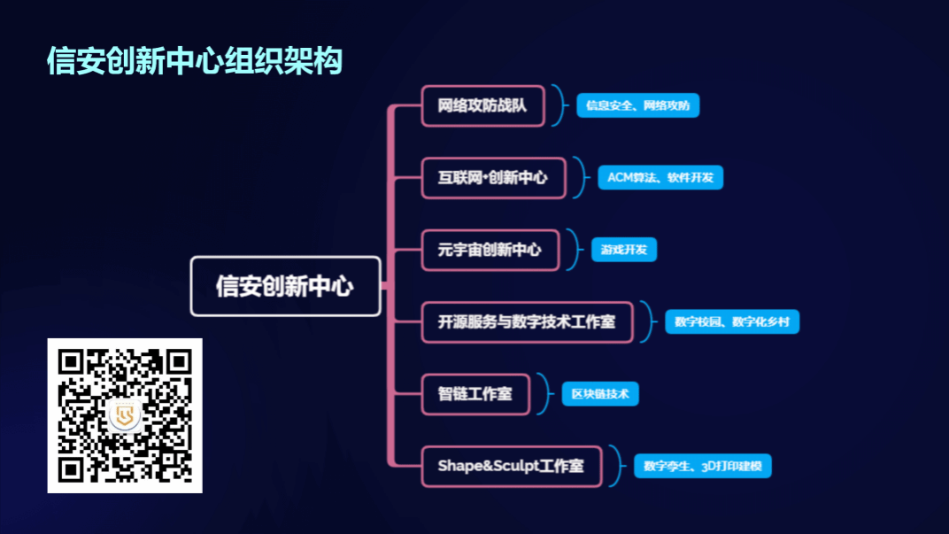 信安工坊分别有:互联网+创新中心、元宇宙创新中心(云帆工作室)、开源服务与数字技术工作室、网络攻防战队、智链工作室、Shape&Sculpt工作室。有感兴趣的小伙伴自行探索哦!公众号:信安工坊。