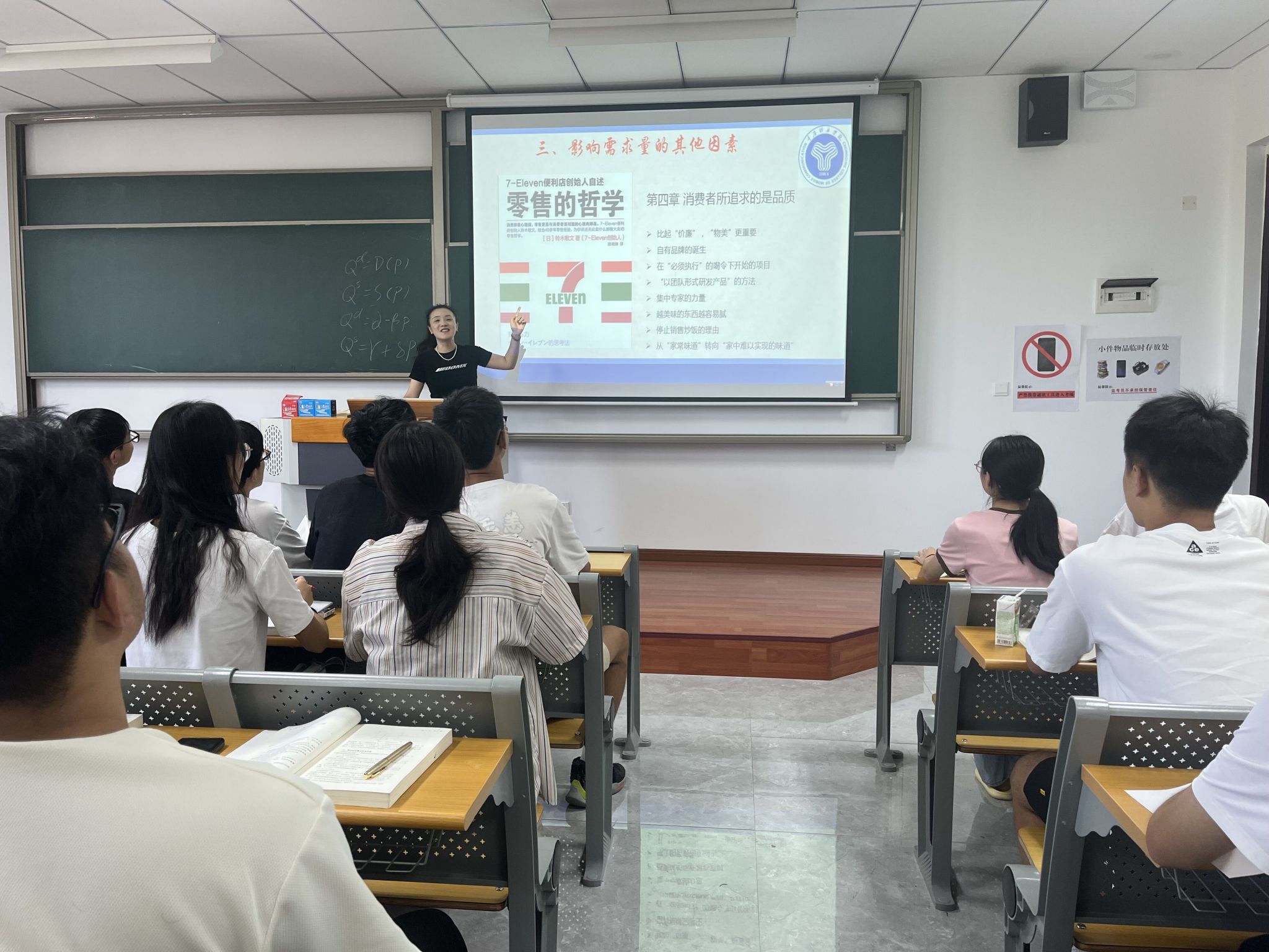 冉叶虹老师根据课程内容将大咖阅读融入课堂,帮助同学们在领略大咖精神的同时更好的学懂掌握相关知识点,例如在给2022级管理科学与工程类专业4-5班的同学们讲经济学原理中需求这个知识点时,借助零售哲学书中第四章消费者所追求的是品质,从比起“价廉”“物美”更重要、自有品牌的诞生、越美味的东西越容易腻等内容来讲解分析影响需求量的因素,讨论7-11是如何留住客户,占领市场,抓住需求的。