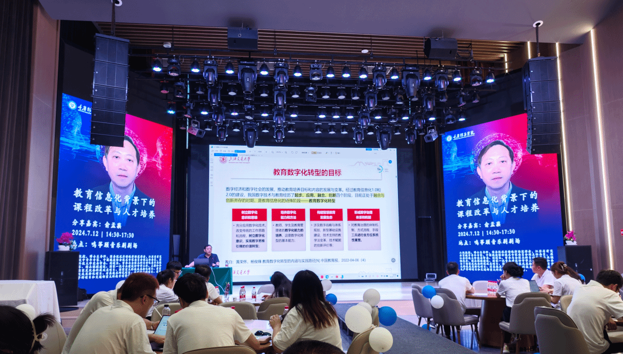 7月12日下午,江苏科技大学俞孟蕻教授为老师们带来了《教育信息化背景下的课程改革与人才培养》专题讲座,教育信息化是当前教育领域的重要议题,其涉及到教学模式与理念等多方面的变革,对于提升教育教学质量、优化教育管理服务等方面都具有重要的意义。俞教授首先介绍了高等教育数字化战略的内容,强调了数字化战略对中国高等教育的重要性;随后阐述了推进教育新基建的6个重要版块、教育数字化转型的内涵以及核心要素等内容,并与教师进行了交流互动。俞教授指出,教育数字化正在向全领域渗透,对于人才培养,依旧要坚持以学生为中心、坚持立德树人、坚持需求服务,在课程改革上,应引入最新的科技成果和行业动态,让课程多元化,且内容更加贴近于实际,满足社会发展的需求。