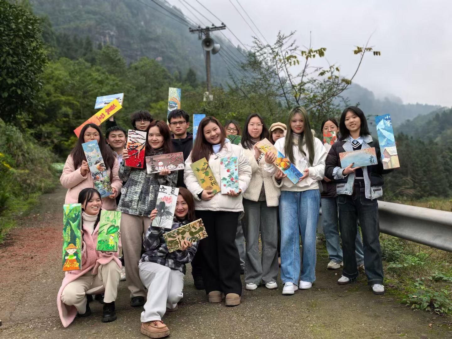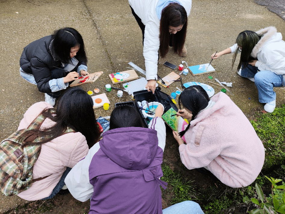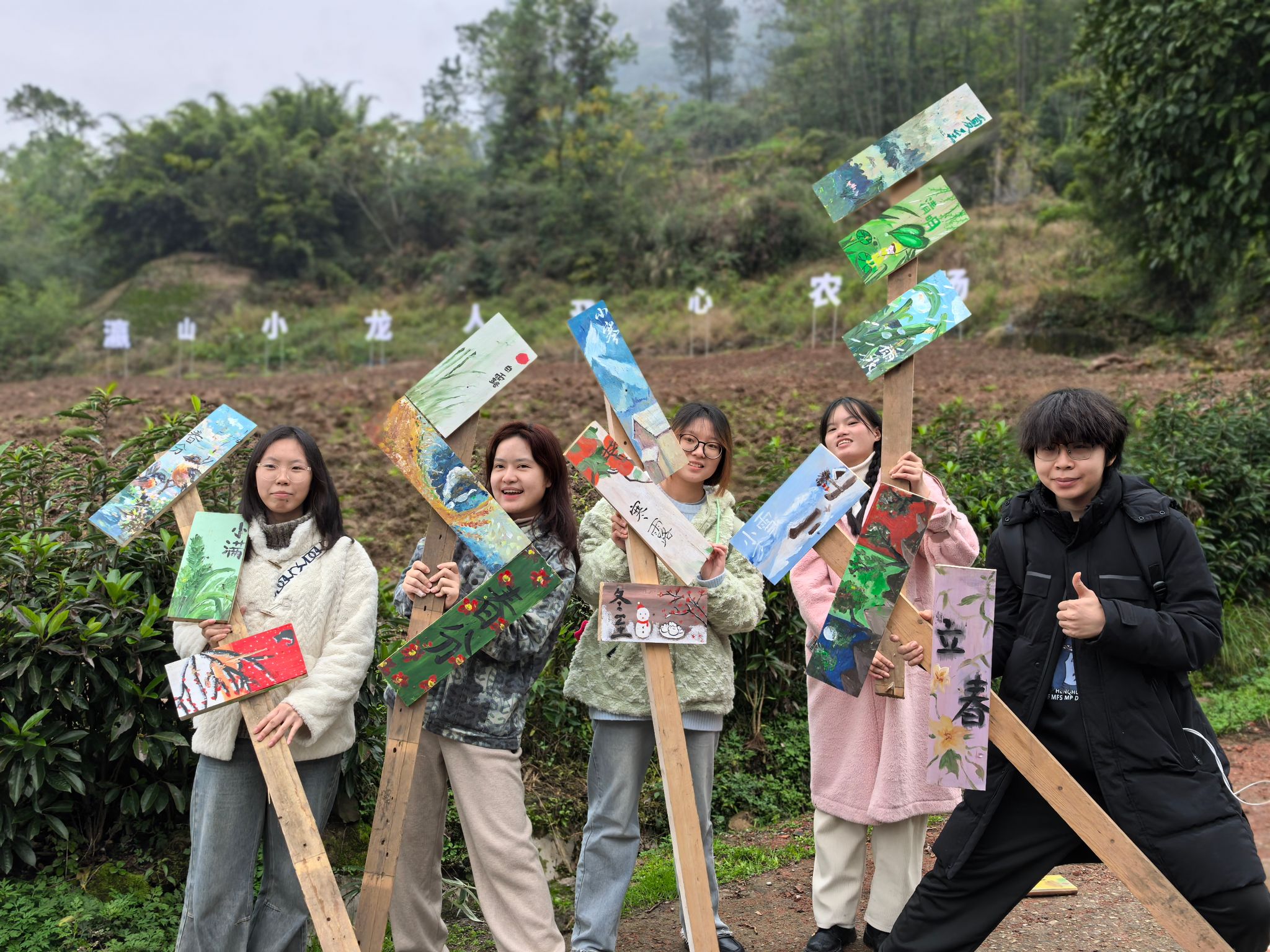 到达农场,它还未经粉黛的“雕琢”,阴郁的雾色下,光秃的农场更显凄美。空气里夹杂着寒冽的冷风,吸进鼻子里会发疼,但山间的田野气息像是暖洋,中和了疼,稀释了冷。今天的活动是让同学们给农场带来色彩,带来生机,在木板上画二十四节气的插画。冬季植物渐渐枯萎了,但五颜六色的颜料却在绽放,加上同学洋溢着的热情的笑颜更像是推进了春天的到来。冻僵的手握住画笔,画出了心目中四季的颜色。画作完成,大家合影留恋,农场留下了我们的画作,是冬季里永不枯萎的缤纷。