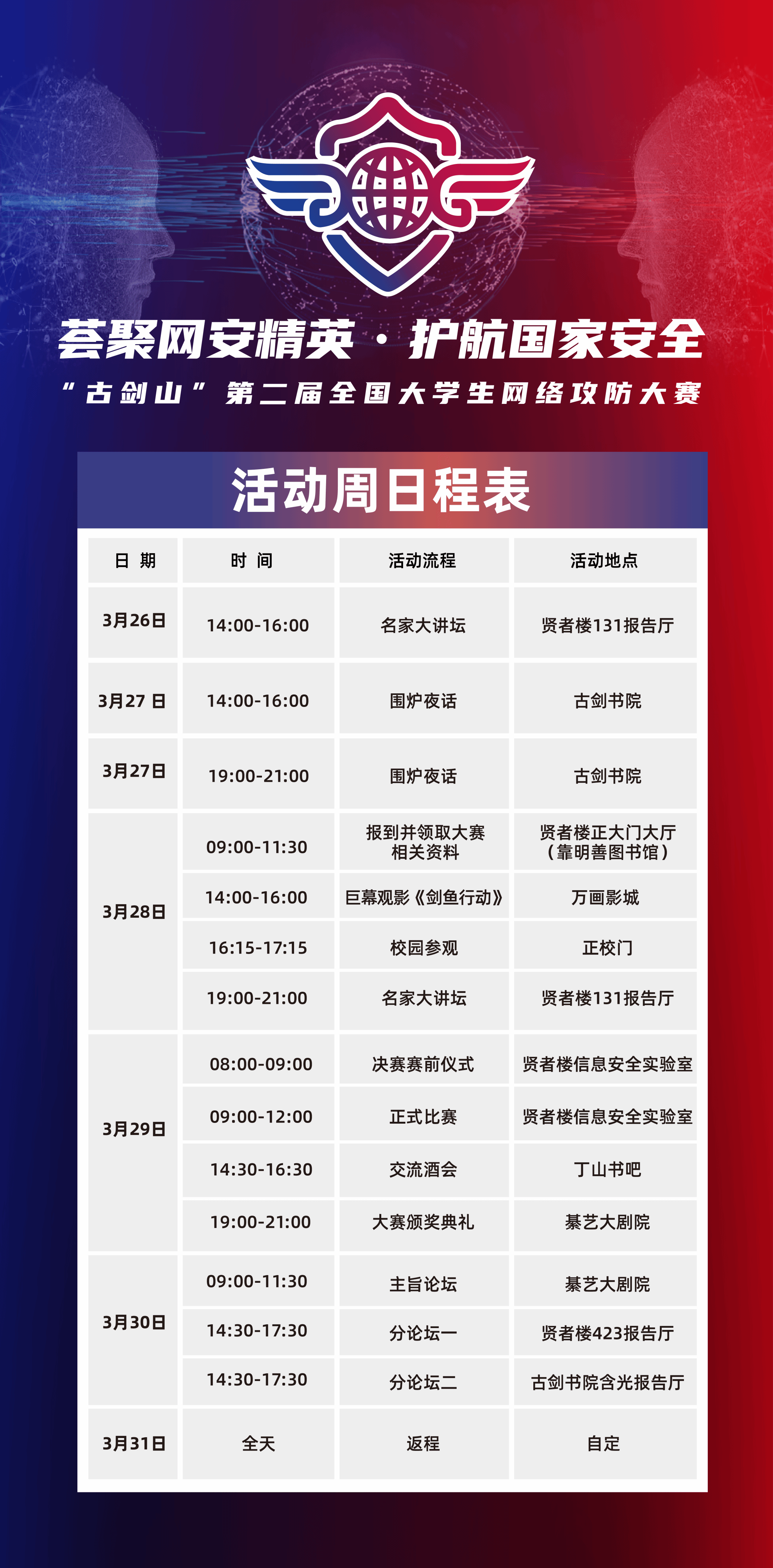 “古剑山”第二届全国大学生网络攻防大赛活动周即将开幕,让我们一起相约重庆移通学院,共赴盛会!