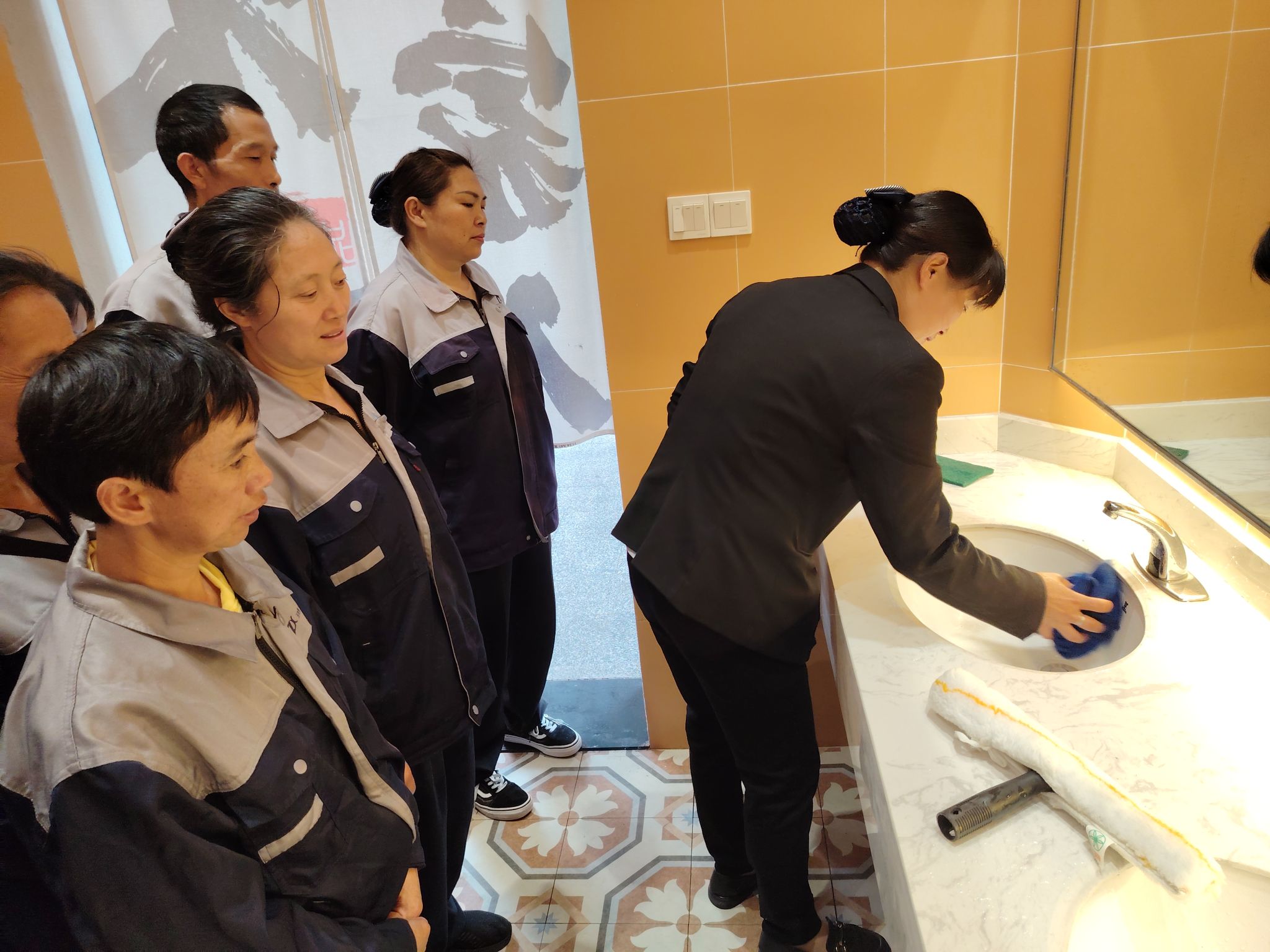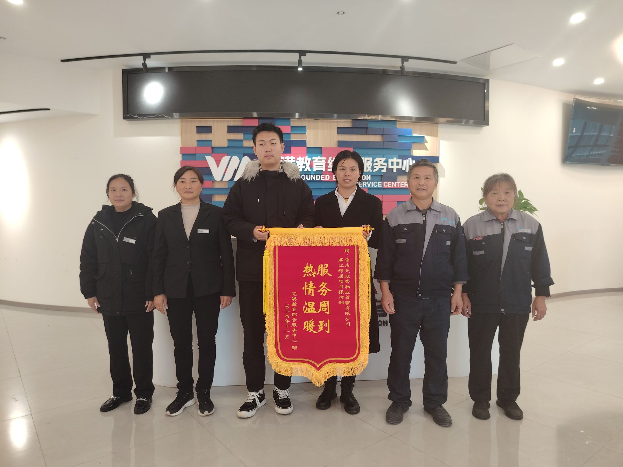 2024年8月,酷热的天气并未阻挡李大容的工作热情。面对三期新修楼栋的开荒清洁工作,她主动请缨,带领团队投身到这场艰巨的任务中。此时,新生报到与开学迎新工作同步进行,新员工培训也迫在眉睫,各项工作交织在一起,形成了巨大的压力。但李大容并未退缩,她凭借多年的工作经验和卓越的领导能力,精心规划,将清洁任务进行细致分解,合理调配团队成员的工作时间与分工。她像一台不知疲倦的机器,马不停蹄地穿梭于清洁现场、迎新地点以及员工培训场地之间,确保每一项工作都能有序进行。最终,在她的带领下,团队圆满完成了开荒清洁任务,为新生提供了一个整洁、舒适的校园环境。为此,李大容荣获了完满教育部门赠送的锦旗,这是对她辛勤付出的最好肯定。她羞涩地说,我到移通工作,就是来为师生们好好保洁的,让他们安心读书。这是我的初心。