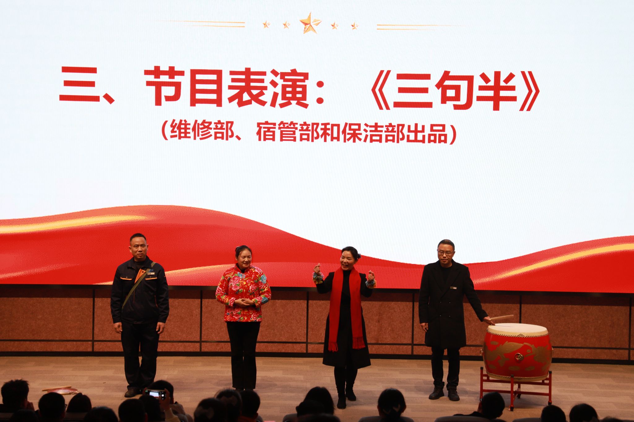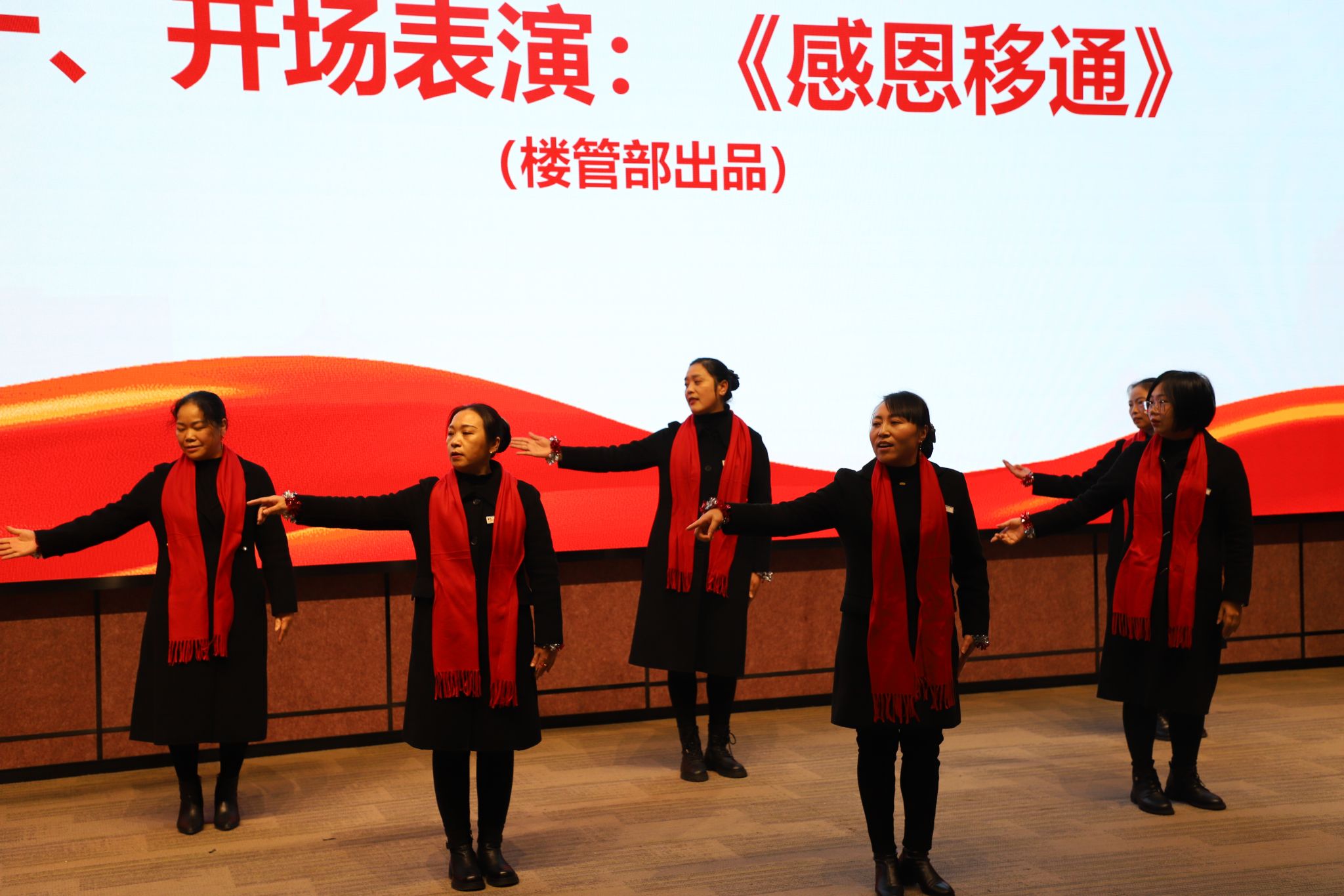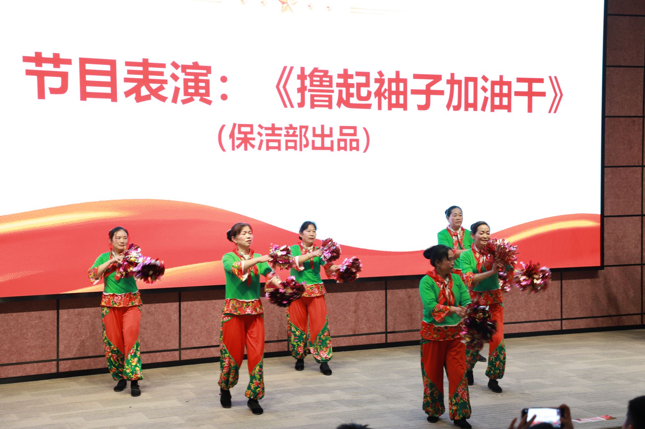 大会最后,在物业人员精彩表演中结束。未来,学校将以此次表彰大会为契机,进一步激发广大后勤职工的责任心和荣誉感,不断提升服务质量,为学校高质量发展注入强劲动力。发挥后勤服务育人价值,将秉持让学生“友好地为所欲为,肆意地野蛮生长”的服务理念持续深耕,在服务水平与质量提升的道路上稳步迈进,以责任为基、用爱心浇灌,全力为师生营造一个充满温馨、舒适与安全氛围的学习生活环境,让关怀与守护融入校园的每一处角落。