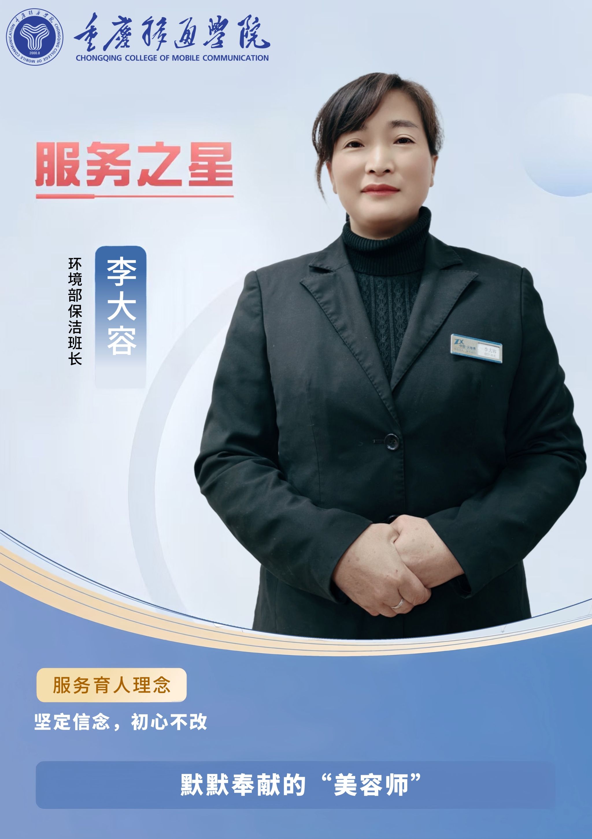 在移通学院,有这样一位默默奉献的“美容师”,她用勤劳的双手和坚定的信念,为校园环境的美化贡献着自己的力量。她,就是李大容,移通学院环境部保洁班长,一个在平凡岗位上创造不平凡价值的优秀职工。