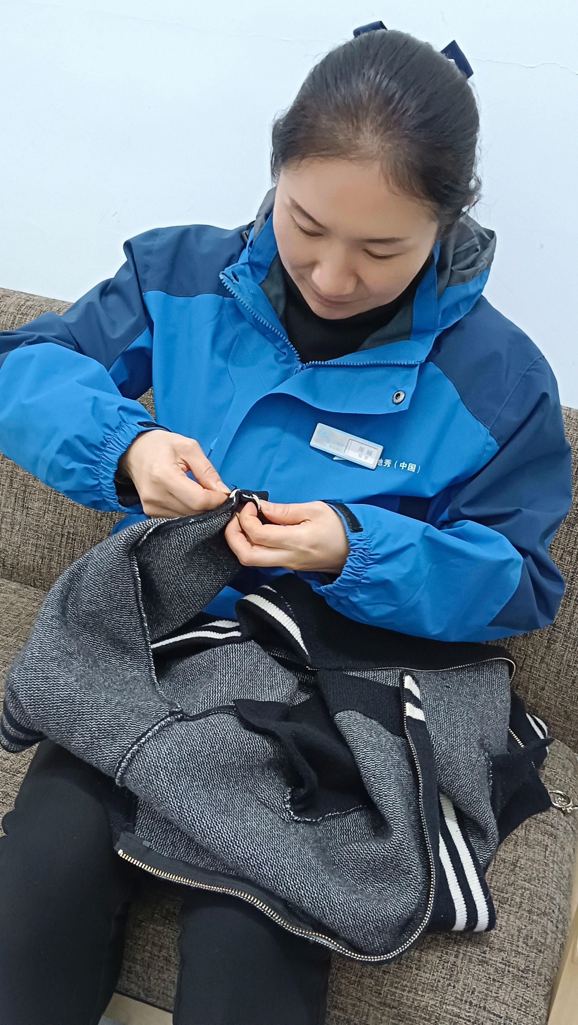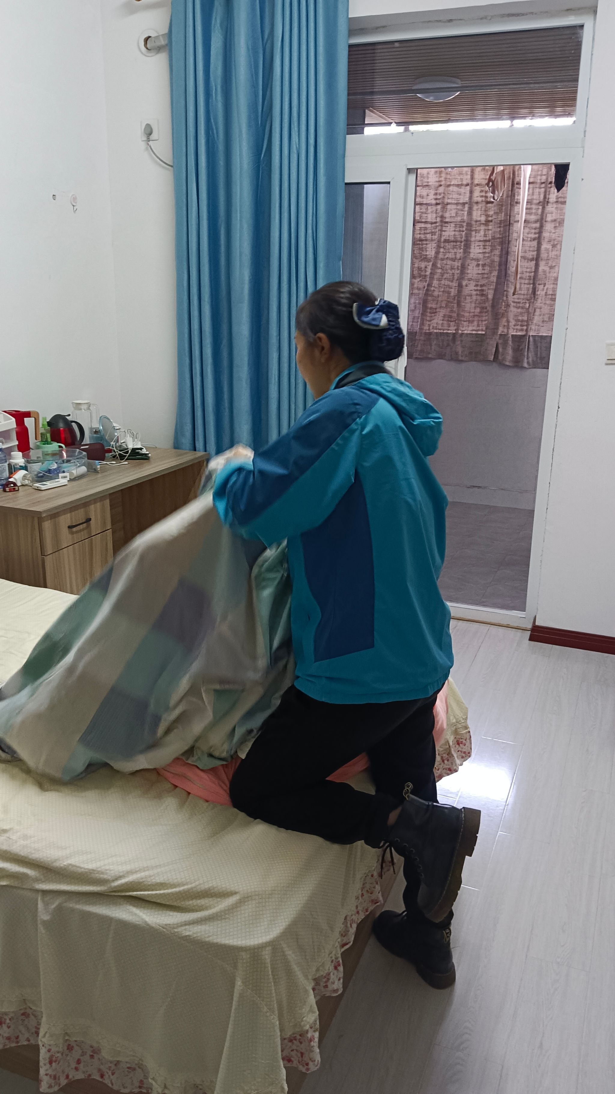 在2024年2月至10月的时间里,有一位住在无障碍室的同学,因身体原因在日常生活中面临诸多不便。其中,无法独立铺设床铺是他常常遇到的难题。周丽老师得知这一情况后,便主动承担起帮助这位同学的责任。她不仅细心地帮忙铺床,更在每次换季时为他更换床单、被套。有一次,这位同学因身体虚弱连衣服都无法清洗,周丽老师不仅帮他洗衣,还发现衣服袖口处有破损,便在值班间隙为他细心缝补。那一针一线,不仅缝好了衣物,也缝进了她对学生深深的爱。