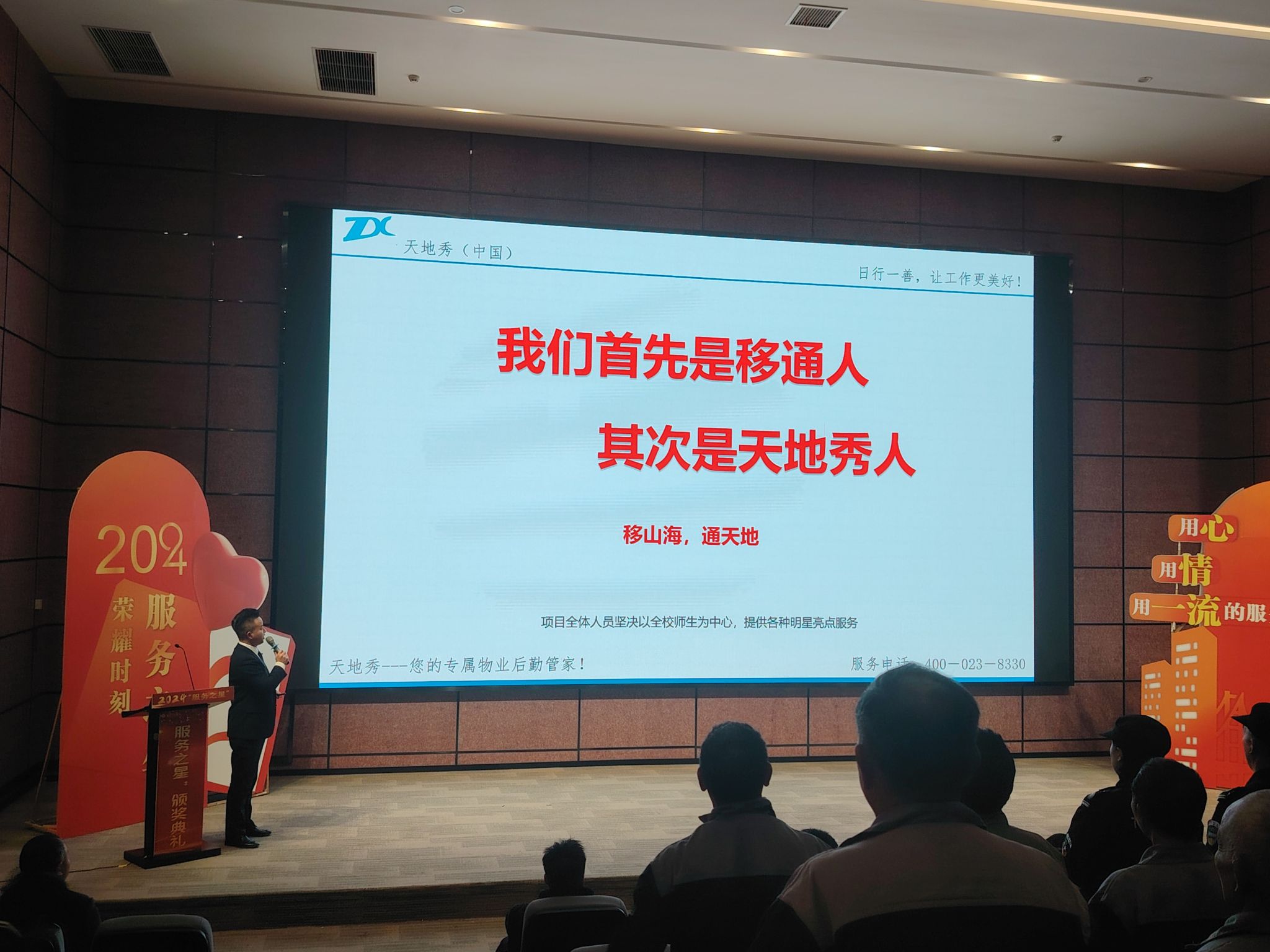 天地秀物业项目经理胡伟就2024年度物业工作及亮点工作做了全面总结,并梳理2025年工作计划,物业团队展现出了非凡的韧性和创新能力。从校园保卫的严密部署,到校园环境的美化升级;从宿舍管理的温馨细致,到楼栋、器材、游泳池的精准无误。并表示2025年的工作目标:“日行一善,让移通更美好,做好细节用一流的服务助力双一流之外首选大学的梦想与实践”。