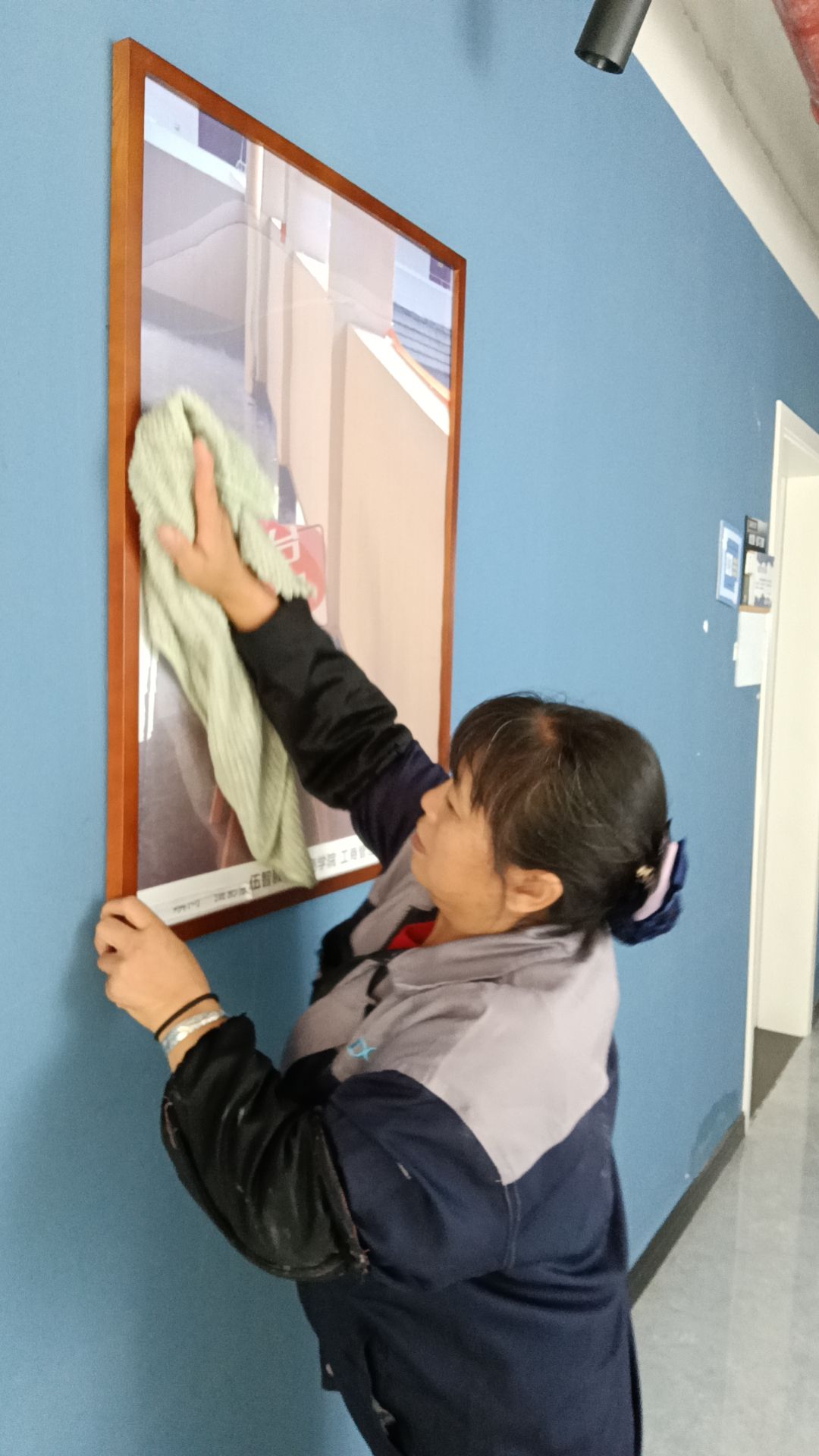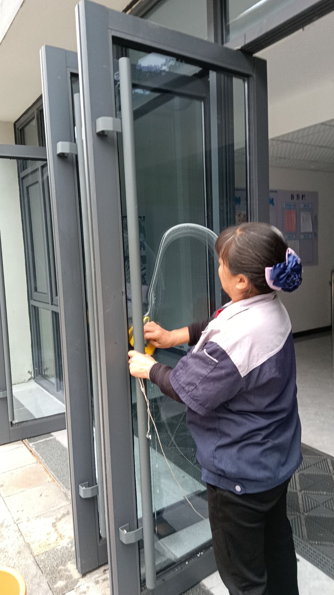 谢德秀还曾在一次特殊任务中展现出了她的坚韧与耐心。那是2024年秋季学期初,三期工程刚刚完工,需要进行全面的开荒清洁。面对满地的建筑垃圾和厚厚的灰尘,谢德秀主动承担起了最具挑战性的玻璃开荒任务。玻璃上布满了厚厚的积尘和顽固的污渍,清洁起来异常困难。但谢德秀并没有退缩,她眼神坚定,手握抹布和清洁剂,一块一块地精心擦拭着玻璃,手被划破了,包一下继续工作。