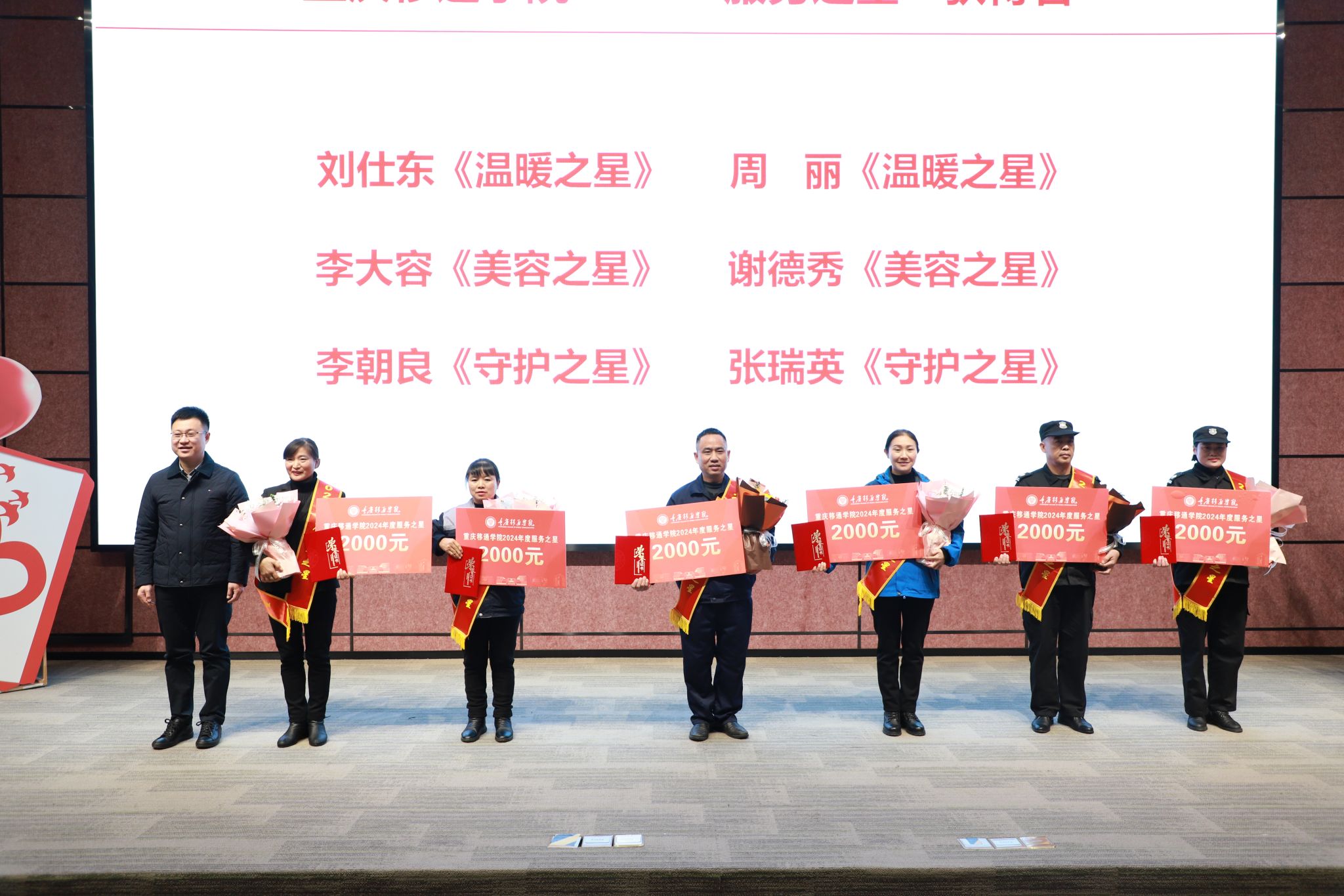 校长助理梁少锋为获奖者颁发绶带、荣誉证书、奖金。受表彰的刘仕东、周丽、李大容、谢德秀、李朝良、张瑞英,他们在后勤工作不同岗位,他们的先进事迹激励和彰显着不同岗位的价值。
