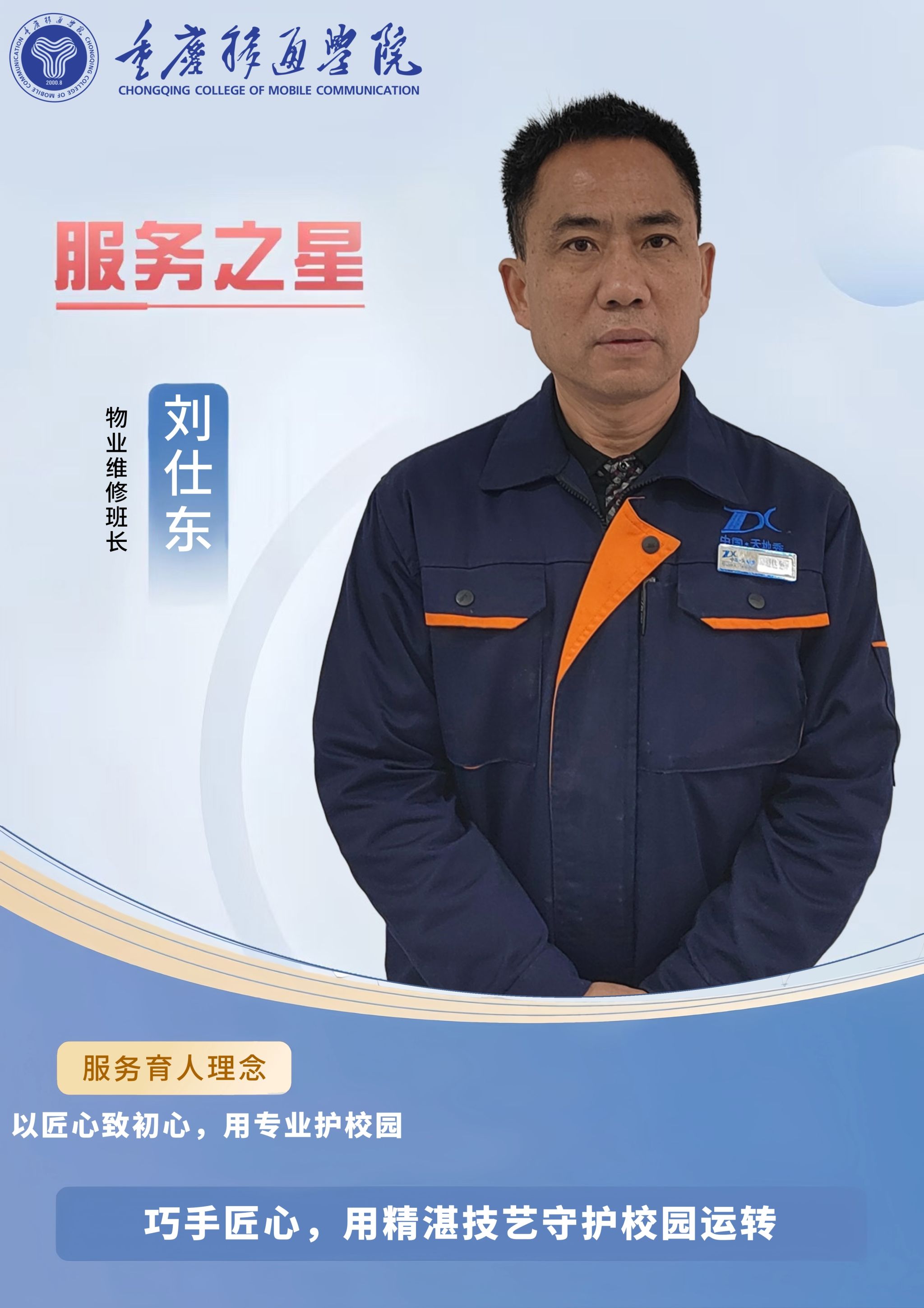 刘仕东是一位普通的维修班长,但他的工作却非同寻常。他用自己精湛的技艺与无私的奉献,为校园筑起了一道坚实的保障线。他不计得失,不辞辛劳,只为让校园的每一盏灯都亮着,每一滴水都流畅,每一项教学活动都顺利开展。他是移通学院(綦江校区)里一位无声的守护者,是师生心中当之无愧的“服务之星”。