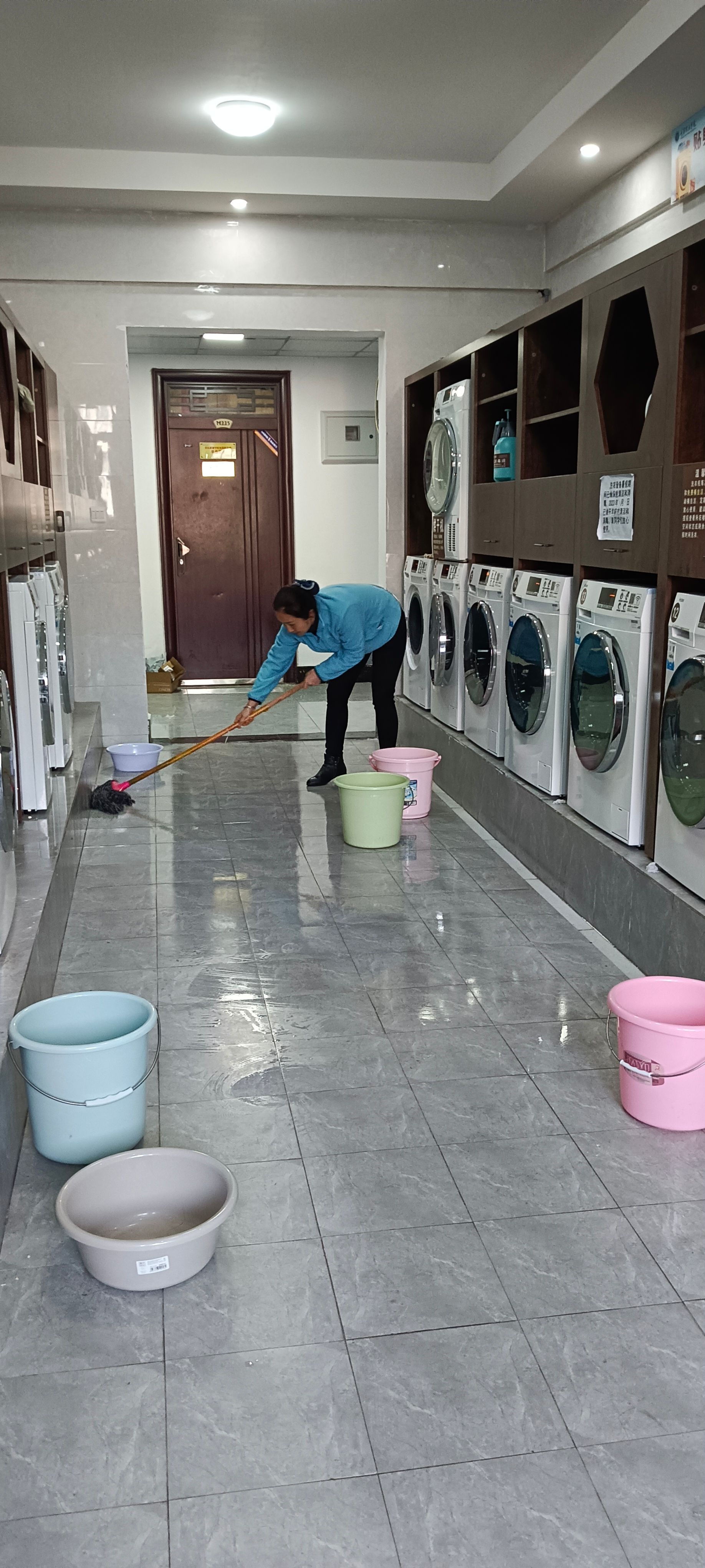 2024年3月23日晚,已是深夜时分,书院的宿舍楼大多已陷入宁静,周丽老师却依然在楼栋中巡查,确保每一个角落都安全无虞。突然,洗衣房传来一阵异响。她立即放下手头的工作,迅速跑向洗衣房。原来,是一台洗衣机在清洗过程中意外倾倒,滚滚水流已将地面淹没。面对这一紧急情况,周丽老师没有慌乱,迅速切断电源,防止水电接触引发安全事故。随后,她挽起袖子,蹲下身子,将地上的积水一点点清理干净,又小心翼翼地整理好学生的衣物。