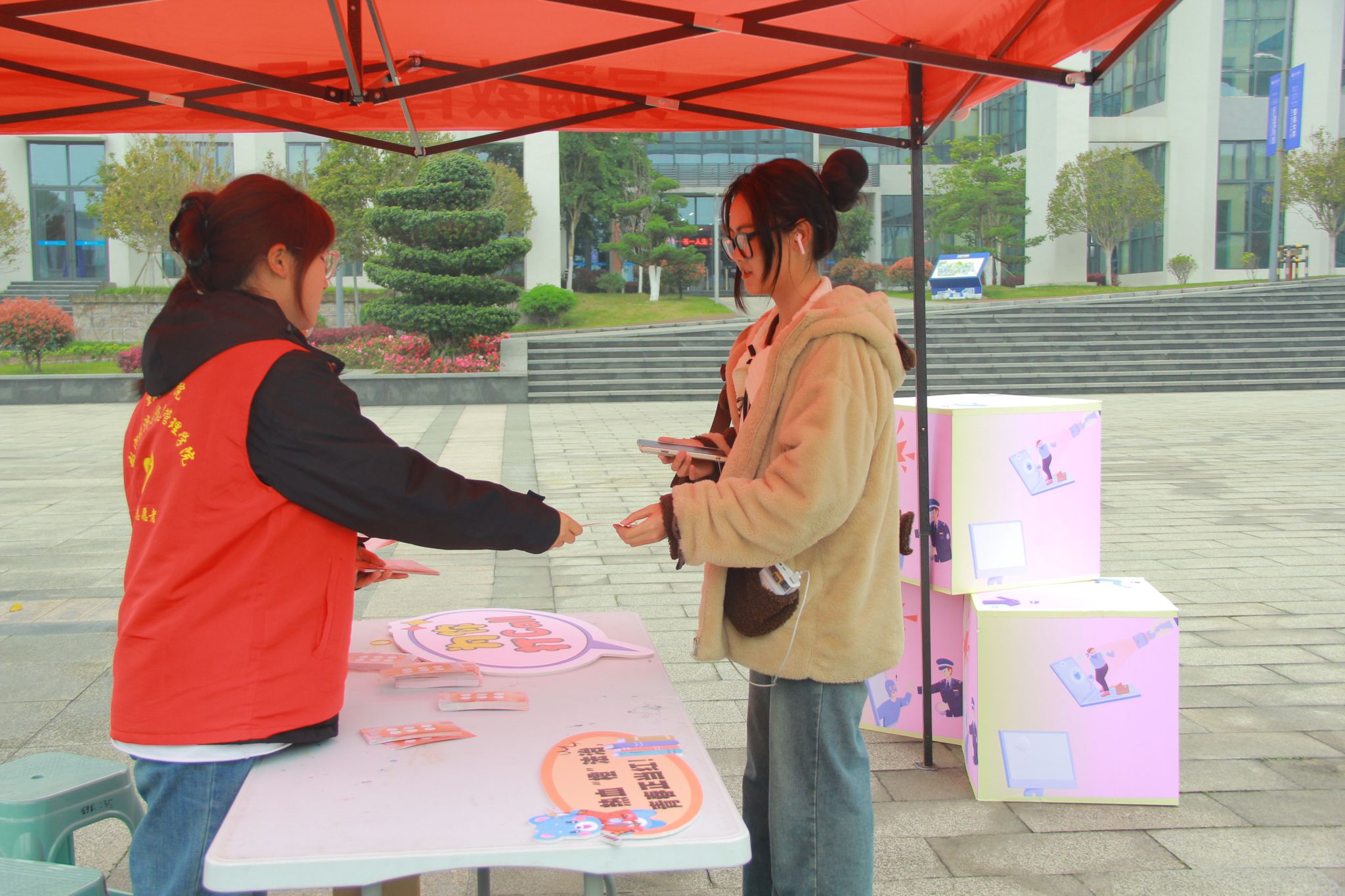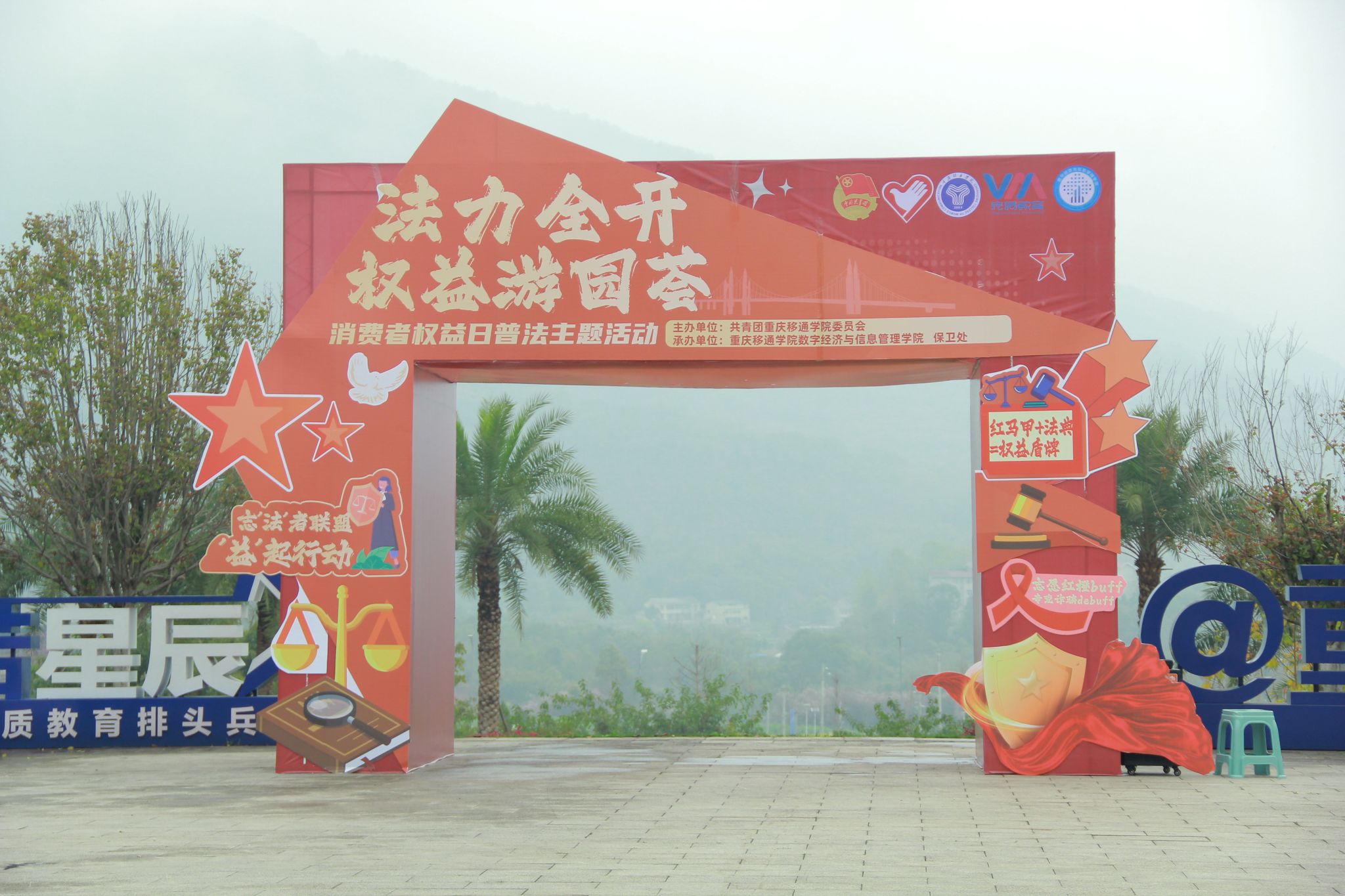 在"3·15国际消费者权益日"来临之际,共青团重庆移通学院委员会联合数字经济与信息管理学院、校保卫处共同打造的"法力全开·权益游园荟"普法活动,于3月14日下午在瀛山图书馆广场顺利举行。活动现场巧妙融合法治教育与趣味互动,以六大沉浸式互动展台为载体,为500余名学子开启了一场别开生面的法治实践课。打造了一堂"可触摸、可互动、可带走"的立体法治实践课堂。