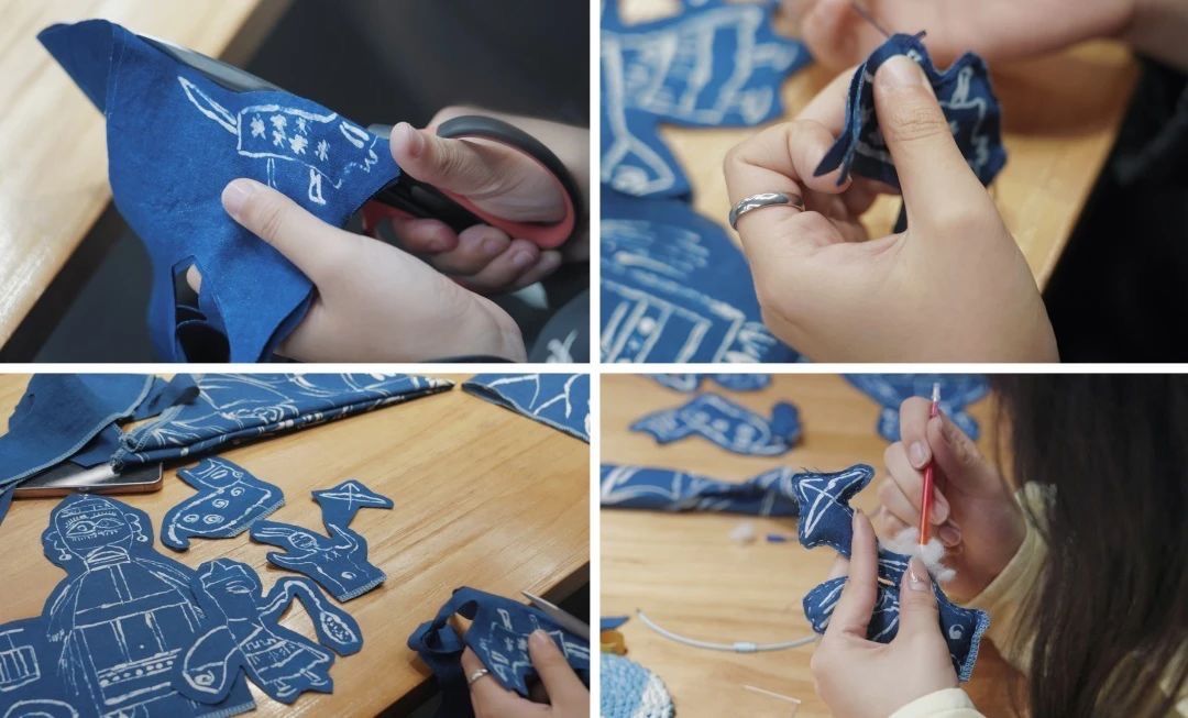 在第三个环节中,艺术再创工坊的成果得以体现,同学们将自己的作品根据工坊所提供的形式内容进行了多样化的呈现,有各种充满民族图案亦或装饰纹样的方形、条形抱枕和星球抱枕,还用各种装饰挂饰对蜡染挎包进行了再创作。不论是图案还是再创形式,在理解和认识中国传统文化的基础上,同学们都学会用当代的认识和发展的眼光来看待非遗文化。
