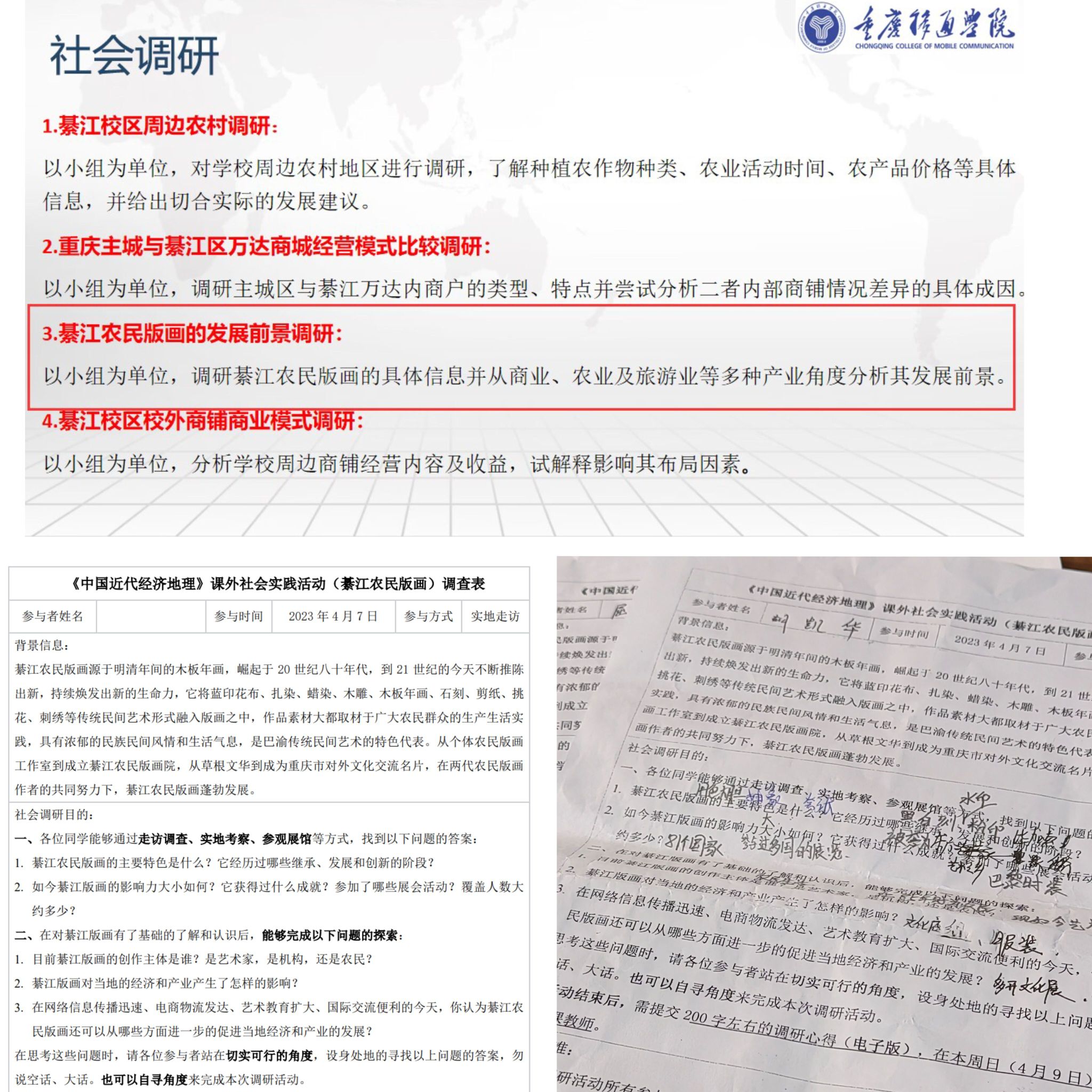 《中国近代经济地理》课程的老师一直重视课程实践的重要性,鼓励学生走出教室、走向社会、走到乡间,进行社会实践和调研活动。课程要求学生将所学知识与实践相结合,以小组为单位完成社会调研任务。两位老师课堂上详细讲解社会调研和分析区域经济现状的相关知识和思路。前期多次讨论,师生选定“綦江版画院”作为课程实践的第一站。调研前,张艳老师与綦江农民版画院负责人多次沟通,确保参观过程有专业讲解人员和版画艺术家做答疑,可以向学生们展示版画制作过程和艺术特色。两位老师还设计了调研指导书,列出一系列相关问题,帮助学生更好的开展调研活动和解决问题,提高实践能力和水平。