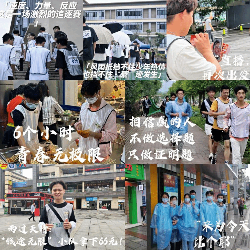 全员加速度,青春无极限,校内经过2个小时的激烈角逐,终有4队“勇士”脱颖而出,在踏出校门的那一刻,全新的考验也悄然来临。读万卷书不如行万里路,涉世未深的队员们在紧迫的时间下,为尽快集齐资金,积极寻求工作,107次求职经历,95次被拒绝,仍坚持大胆尝试与各类商户及路人进行沟通交流。在他们身上看到了困境中沉着思考、风雨同舟的强大精神力量。匹夫不可夺志也,在各小组队员的不懈努力之下,是否尝试过在串串店进行长达6个小时的穿串“苦战”,是否尝试过说学逗唱式的第一次直播。独立奋斗、执着前进,是面对挫折绝不服输的坚定信念。