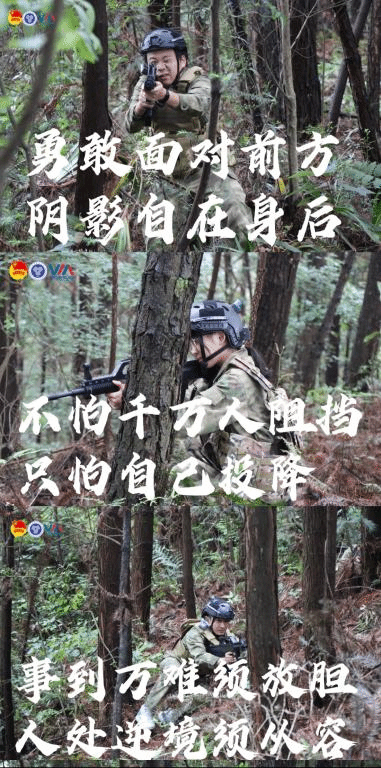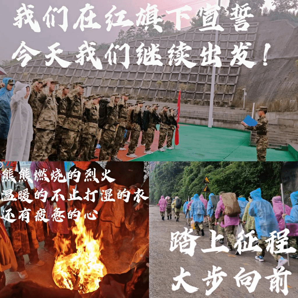 身披迷彩,身姿挺拔,我们生在红旗下,长在春风里。清晨细雨蒙蒙,各小队成员、指导老师集合完毕,他们在国旗下宣誓,每一张顽强坚毅的脸庞都透露着青年独有的朝气,举起右手,整齐宣誓,心中坚定的是“强国”的信念,肩上承担的是时代的希望与红色的使命。徒步走上古剑山军事训练基地,没有精疲力竭的绝望,没有怨天怨地的退缩,连续两天的高强度任务并没有磨灭大家的激情,反而脚步坚毅,攀登向上。虽然有雨衣保护但山中仍然寒气逼人,姜汤暖身后,一身疲惫的重担全然卸下。教练带领大家参观军事基地的各式武装器械,它们不仅是一种物质上的保障,更是对青年的一种精神激励,小心翼翼地抚摸着展示枪支,兴奋的眼神里也流露出对国家强大的自豪和荣耀。