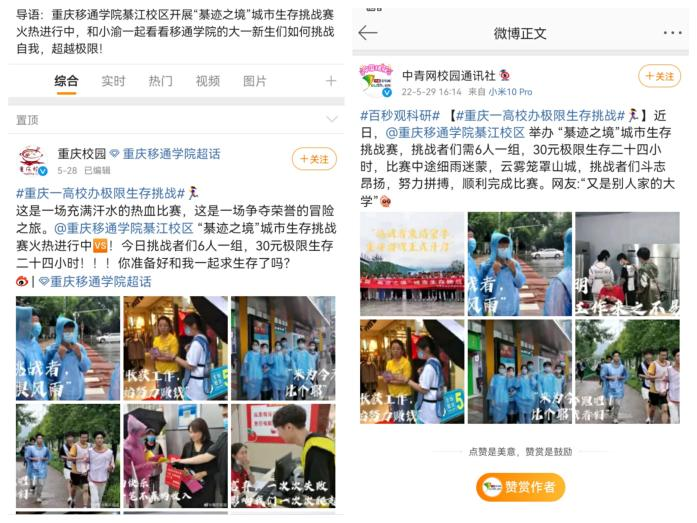 繁琐的生活琐事让人应接不暇,沉重的生活压力叫人止步不前,初出“江湖”的社会新手如何走出迷茫?体验“情商、财商、挫折、体能”四大考验,助力青年大学生突破新生,在逆境中完成蜕变,重庆移通学院(綦江校区)首届“綦迹之境”城市生存挑战赛于5月27日正式拉开帷幕,72小时极限挑战,18项游戏关卡,19公里徒步拉练,25人的镞砺括羽,110名工作人员的保驾护航,人均每天40000+的步数,这场与青春逐力的较量也将化为成长道路上的佐证。本次活动微博阅览量达1753000余次,持续两天霸屏同城热搜榜,引起重庆校园、中国青年网等多家媒体转发关注。