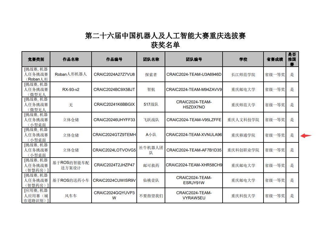 近日,中国机器人及人工智能大赛重庆赛区组委会公布第二十六届中国机器人及人工智能大赛重庆选拔赛获奖名单。本次市赛来至重庆市各高校共303支队伍,于2024年5月24-26日在重庆财经学院进行市级选拔赛。经过激烈的角逐,计算机学院的学子在比赛中克服重重困难,最终凭借扎实的专业知识、卓越的创新能力以及良好的团队协助能力,斩获多项殊荣。最终刘黔渝、桂若添、黄钰瑶组成的参赛队伍一举斩获挑战赛——机器人任务挑战赛(小型桌面级)赛道的一等奖,唐诗益、杨林、高逸凡组成的参赛队伍一举斩获创新赛——智能家电创新赛道的二等奖,彭海淋、刘星、李家宝组成的参赛队伍一举斩获创新赛—机器人创新赛道的三等奖。