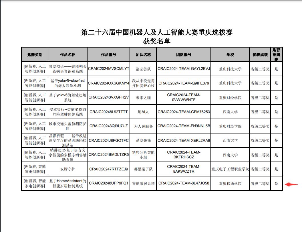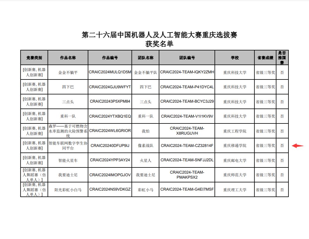 据悉,本次大赛由重庆市教育委员会、重庆市人工智能学会主办,重庆财经学院、重庆师范大学智慧教育研究院承办,旨在激励青年学生弘扬创新精神,推动人工智能、机器人产业的发展,并提升学生们的科技创新实践能力。本次大赛执行“校赛—省赛—国赛”三级赛制,晋级市赛队伍464支,其中161支队伍推荐参加全国专项赛选拔赛。推荐获得重庆市一等奖、二等奖的部分队伍参加2024年第二十六届中国机器人及人工智能大赛全国总决赛。计算机学院学子通过自行设计、制作机器人,认真完成创新赛和任务挑战赛,展示了我院学子在机器人及人工智能领域扎实功底和创新能力。