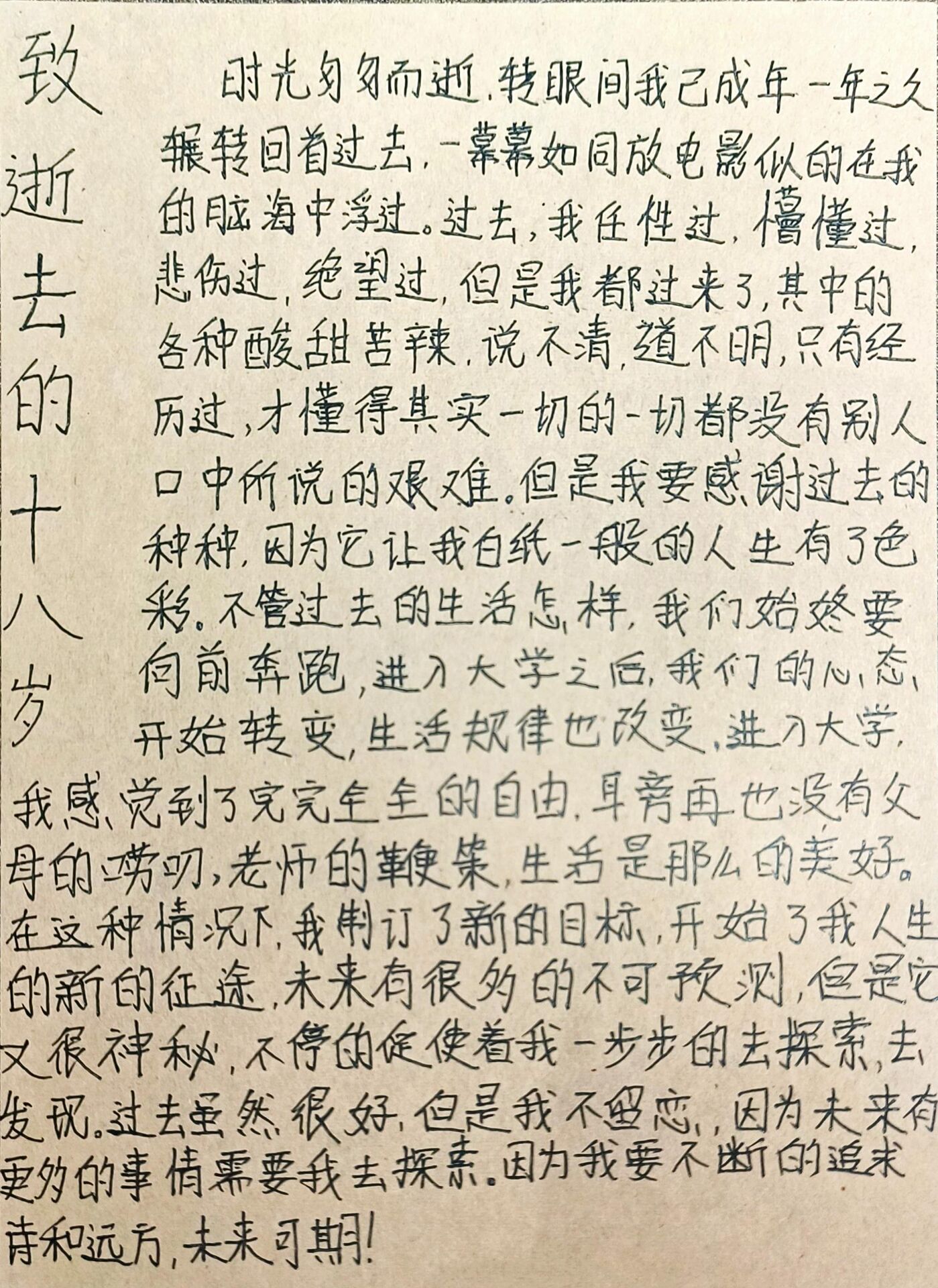 记忆最深刻的是高考前的誓师大会。那天1000多人站在操场上,站在我们前方的,是老师和未来,站在我们后面的,是学弟学妹和我们留下的青春。当我看见我年级主任将属于我们的青春旗帜庄重的交给了那群新面孔的时候,我清楚的意识到,属于18岁以前的青春就要结束了,我更应该以一个成年人的心态去面对未来的一切了,但我并没有觉得惋惜和留恋,因为热血并不会因为年龄而冷却,那时我们喊着少年中国说,我的心中也满腔热血,好像有什么东西从我的脚底冲上了大脑,整个人都为之一振。那天阳光也正好,我的整个世界也镀上了璀璨的金边,我只觉得——18岁以后的人生将精彩万分。