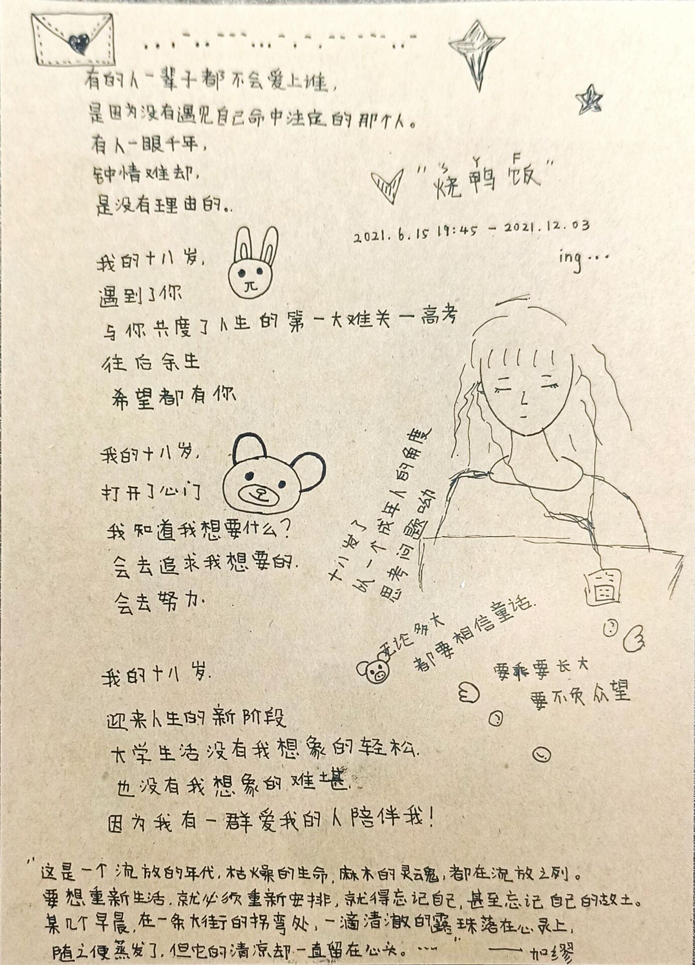 结语:18岁,对书院学子有着一个不近不远的距离,从封存的记忆中寻找它,打开两页泛黄的同学录,拿起几张奇怪搞笑的照片,18岁便风一般地吹过书院学子的生命,带来短暂的触动与片段的回忆。
