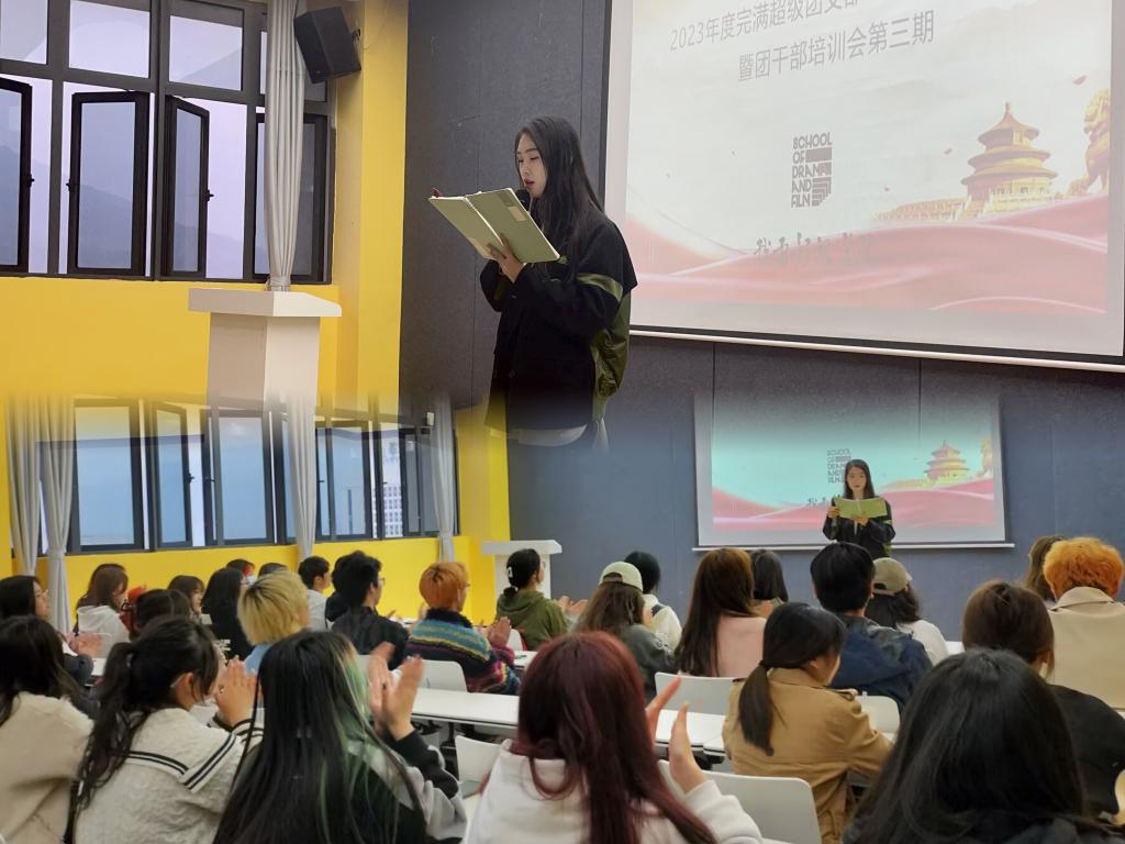 完满超级团支部结合我校四位一体育人理念和完满教育实践平台,深入推进完满教育基层质量建设工作,能够进一步激发基层团组织发挥特色优势,助力班团一体化发展。为增强团干部对于建设完满超级团支部的理解,激发基层团组织活力,2023年3月16日下午18:00,戏剧影视学院组织部在瀛溪书院五号楼回声报告厅召开举办了“定向完满·逐梦完超”——完满超级团支部‘6+x’方案解读暨团干部培训会第三期,本次培训会邀请到淬炼·国际商学院工商管理类05团支部陈文华为大家讲解完超故事、分享完超经验,各班团干部与学院各部门负责人参会,由戏剧影视学院办公室刘雪慧同学主持。