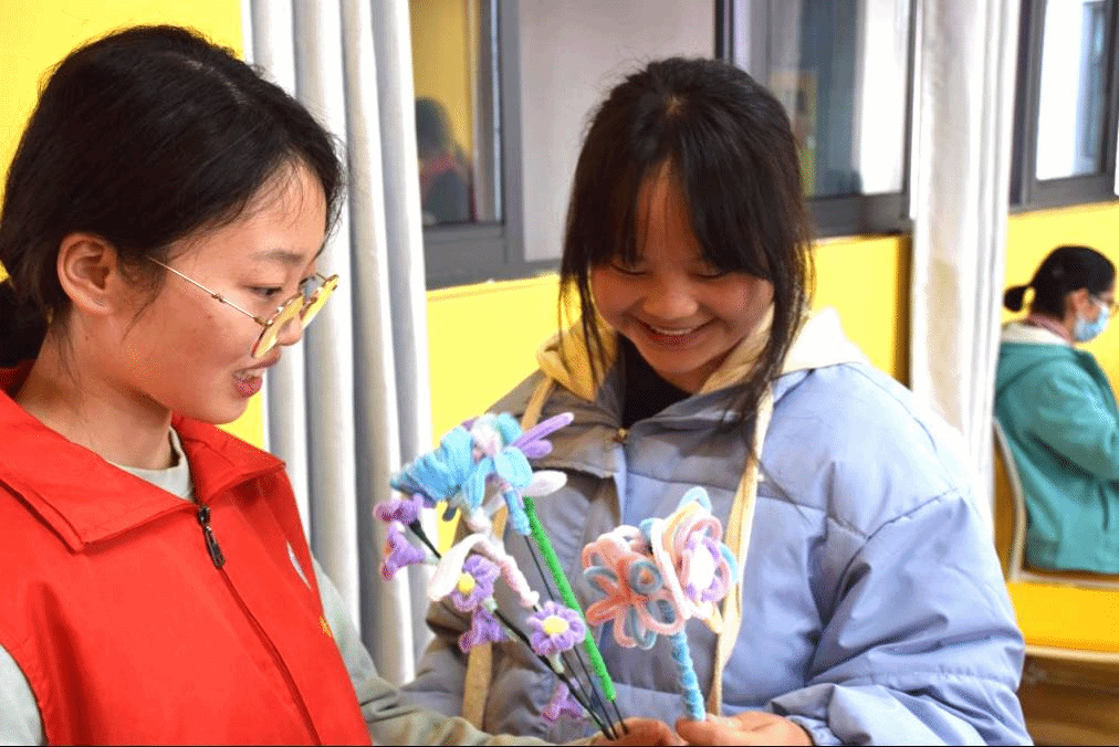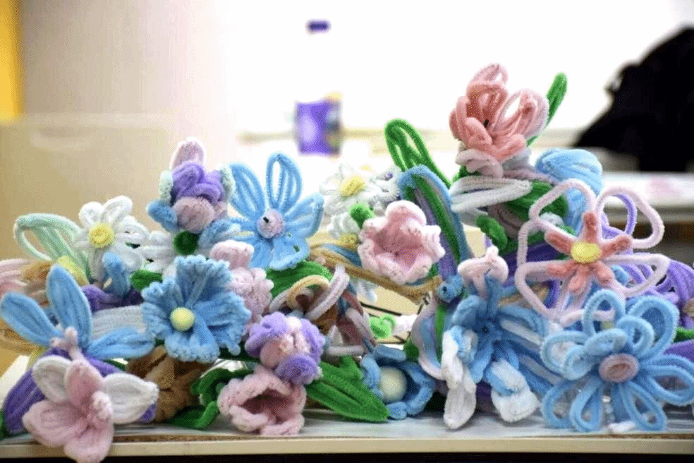第二天的活动中,利用原材料扭扭棒的韧性与可塑性将扭扭棒肆意折叠、扭转,最后变成一朵美丽的小花,扭扭棒在同学们手中通过自己独特的创意进行无限的创作,突破了花艺固有的框架。经过一个小时的制作时间,一朵朵小花“横空出世”,同学们享受着创作成功的喜悦,向朋友炫耀着自己的作品,脸上洋溢的是自信的笑容。