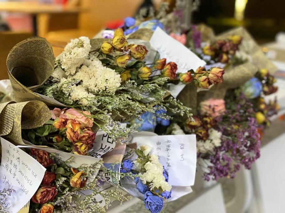 现场参与活动的女生们,专心致志地DIY着属于自己的作品,用心去创作拥有自己想法和特征的干花,暂时告别生活和学习的压力,在插花的过程中觅得一方宁静,一朵朵花在手里绽放出各异的颜色,丰富又美丽。男生们则是在一旁打着下手,为