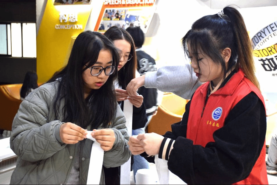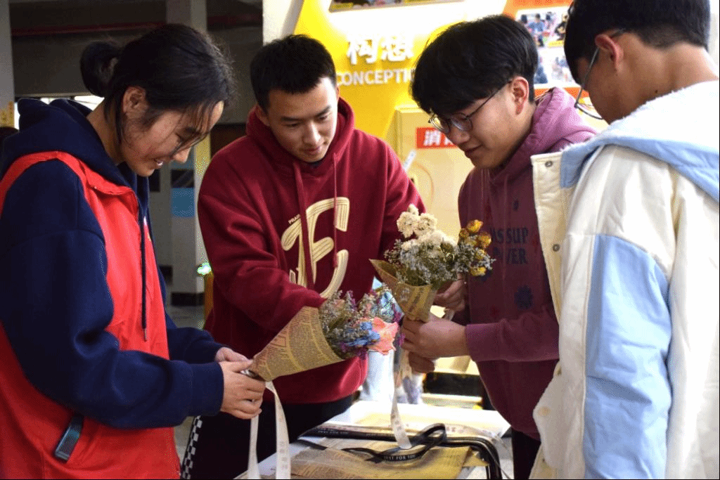 “目”浴花香,艺术绽放。在制作干花和纸花活动中,干花、纸花和书签是这次DIY活动的主要对象。在场的志愿者拿着干花、纸花、丝带等原材料带领参加活动的同学们一步一步折出纸玫瑰花,然后用颜料上色,同时参加活动的小组也可以选择心仪的干花经行搭配,然后用报纸包裹成一束一束的干花艺术品,如玫瑰花,满天星等干花。