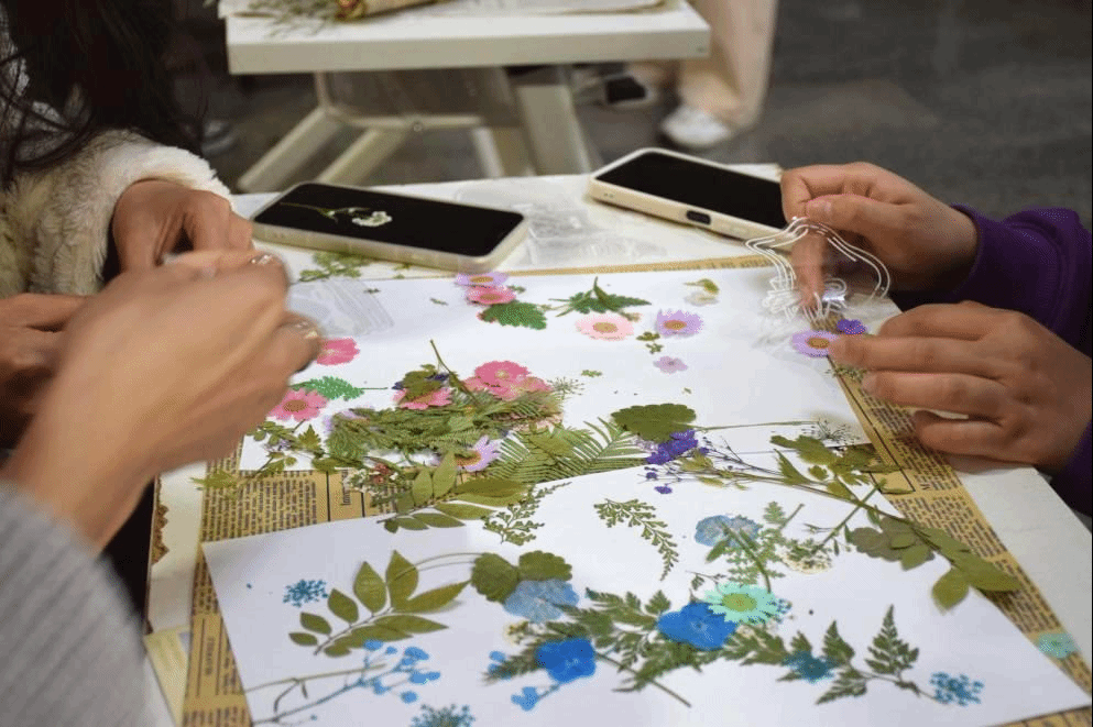 同时,参加活动的同学们还将干叶或干花放在特制的透明塑料里制成书签,不同特点的制作物组合在一起迸发出异样的美,就像各有特性的学生让学校充满青春活力的气息,干花永不凋谢,就像学生的青春与女生的风尚永不消逝。