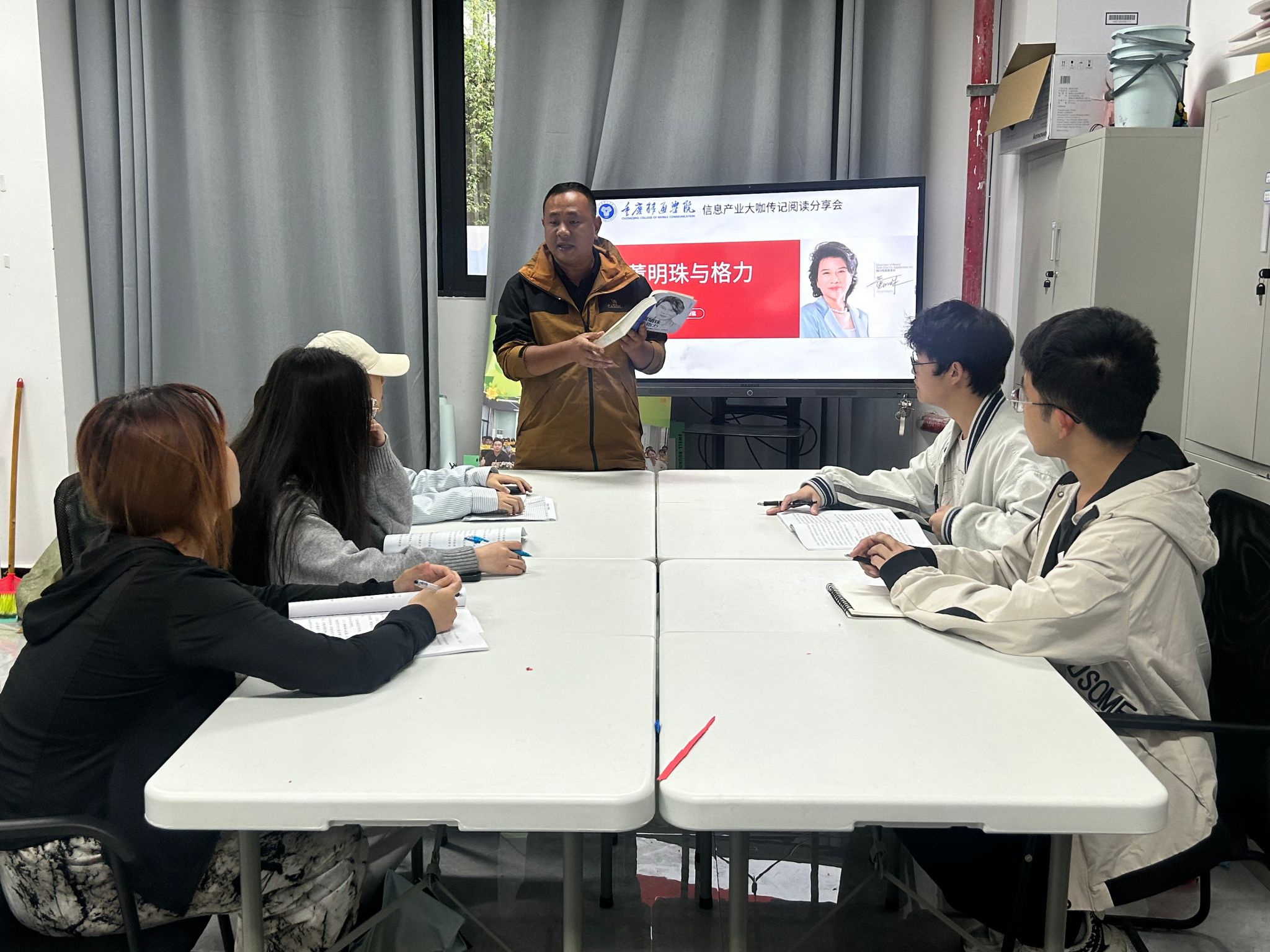 资产管理处(合川校区)资产管理处组织系列阅读分享会,邀请部门8名职工互相进行解读与点评,帮助职工们更好地理解传记内容,把握信息产业发展的脉搏。同时,鼓励职工们积极参与,分享阅读心得,共同营造浓厚的学术氛围。信息产业大咖传记阅读计划的开展,告诉我们创业不仅需要激情和勇气,更需要坚定的信念和不懈的努力。这本书不仅是一本关于创业的书,更是一本关于人生、关于梦想、关于坚持的书。它值得每一个有梦想、有追求的人去阅读、去品味。学生处(綦江校区)4月22日,学生处15人在勇者楼301办公室开展4月信息产业大咖传记阅读分享会。本次分享旨在通过董明珠的创业故事和领导力,激励大家在个人成长和职业发展上取得进步。