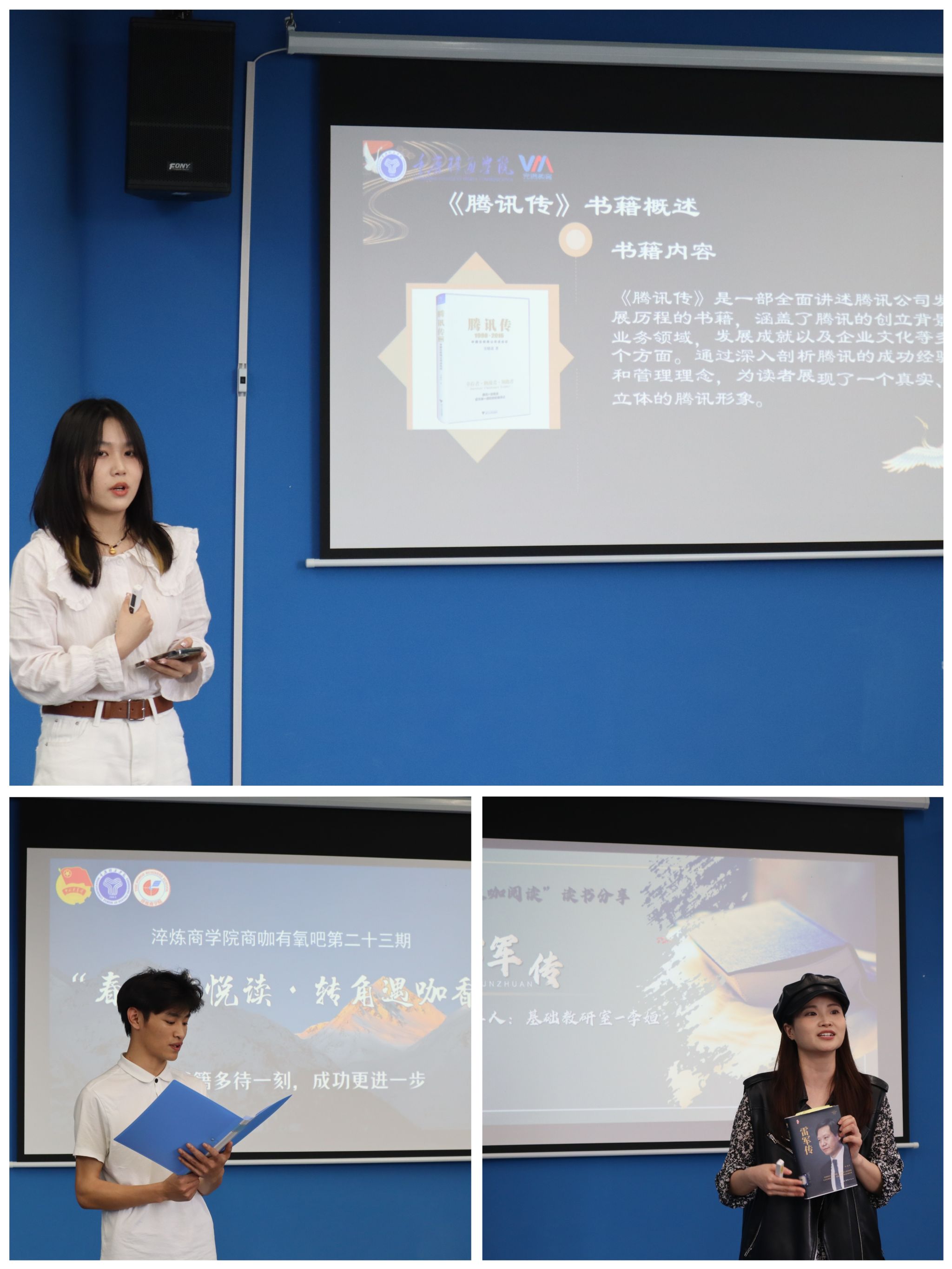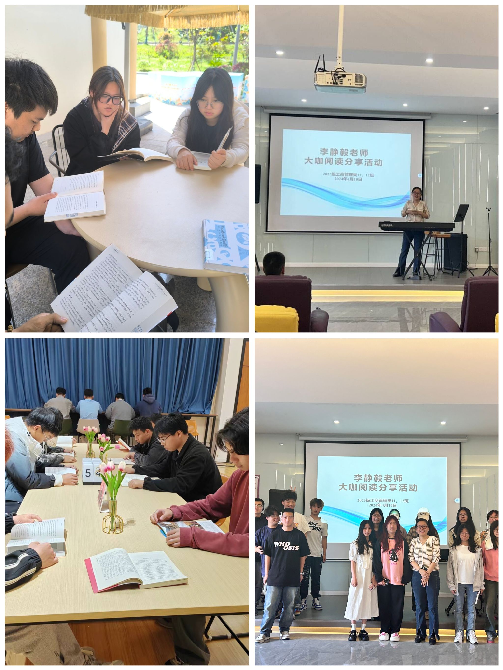 数字经济与信息管理学院(合川校区)数字经济与信息管理学院在双栀书院悦读吧进行“大咖传记”清点,并在双栀305办公室进行书籍登记。工程管理教研室全体专任教师于4月10日在双栀阅读吧开展“大咖阅读”主题读书活动。本月共计开展活动2场,覆盖师生60余人次。马克思主义学院(双校区)4月,马克思主义学院(双校区)积极落实开展信息产业大咖专技阅读计划,合川校区开展了“ARE YOU OK?——雷军”传记大咖阅读分享,綦江校区举行了大咖阅读分享活动,共计开展信息产业大咖趣谈系列活动4次,覆盖师生130余人次。淬炼·国际商学院(合川校区)时光如水总是无言,踏着四月的脚步,校团委联动淬炼·国际商学院于4月17日在天空书院揽江厅·师生交流室迎来了“春光启悦读·转角遇咖香”——淬炼商学院商咖有氧吧第二十三期活动。本次活动旨在通过阅读与探讨大咖著作,吸取成功经验,在墨香中超越自我。