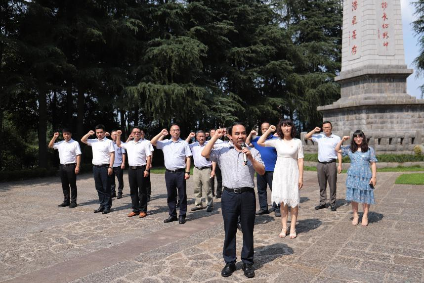 全体党员佩戴党徽,迈着庄重的步伐,依青阶而上,来到松柏翠郁的石壕镇红军烈士墓前,齐声共唱国歌,怀着崇敬的心情向长眠于此的革命烈士鞠躬默哀致敬,并向烈士们敬献鲜花。一枚党徽,一份责任,一名党员,一面旗帜。在庄严肃穆的红军墓前,全体党员集体面向鲜红的党旗,郑重地举起右拳,在市教委一级巡视员邓睿带领下,一起重温入党誓词,现场铿锵有力的声音传递着大家入党时的初心。革命志士的信仰、坚贞、崇高和不朽以及他们不屈不挠的民族精神感染着在场每一位党员同志,他们的事迹激励鼓舞着奋斗中的我们牢记使命,砥砺奋进。