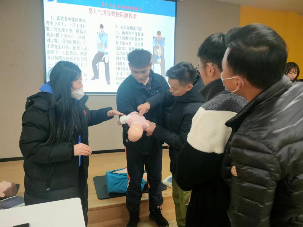 第三部分,实操考核。为了保证培训质量,提高实践操作水平,现场演示后,参会人员自行组队,依次进行心肺复苏、AED使用、气道异物梗阻解除和止血包扎模拟操作实践。期间培训人员现场指导并再次补充讲解知识要点,进一步规范操作步骤和手法。